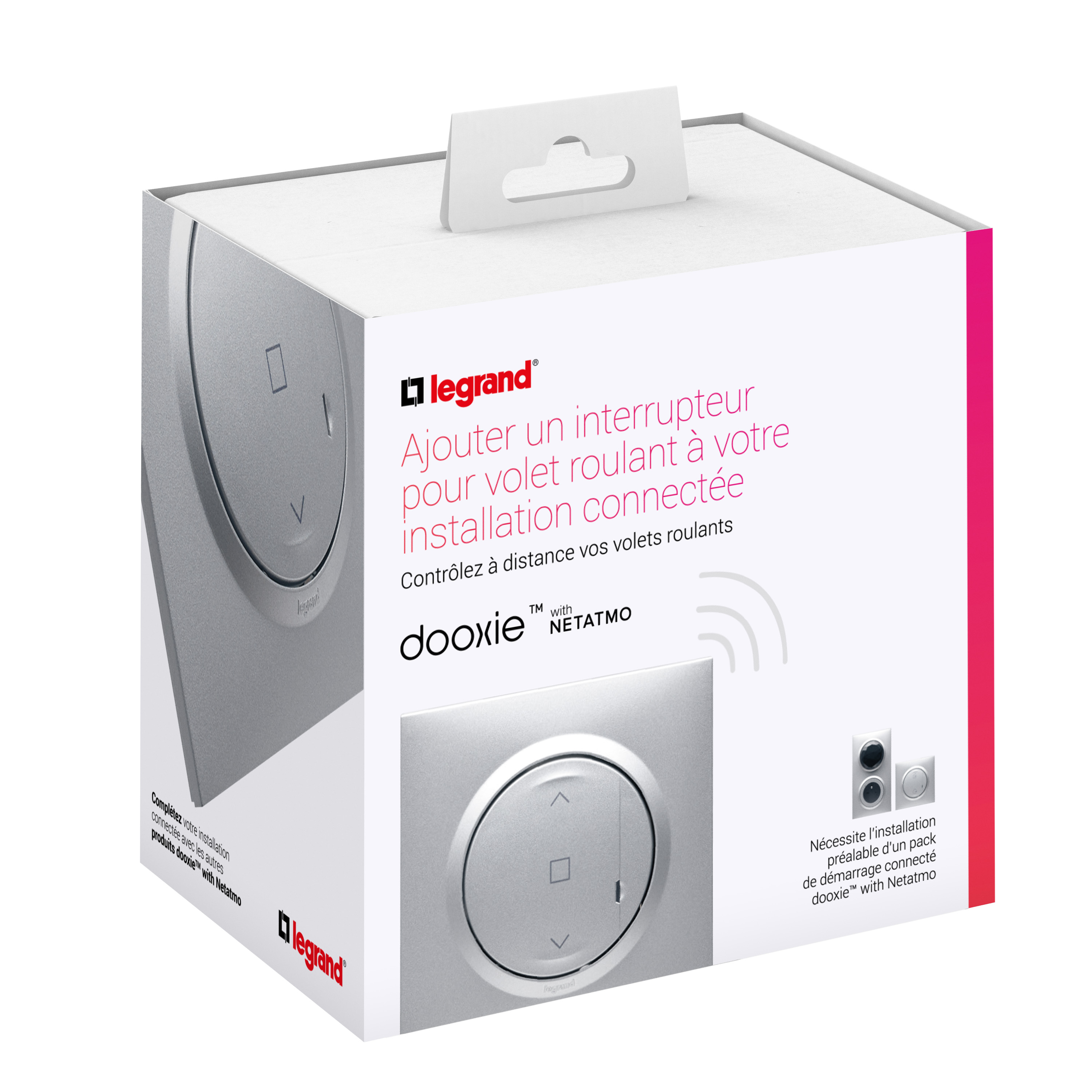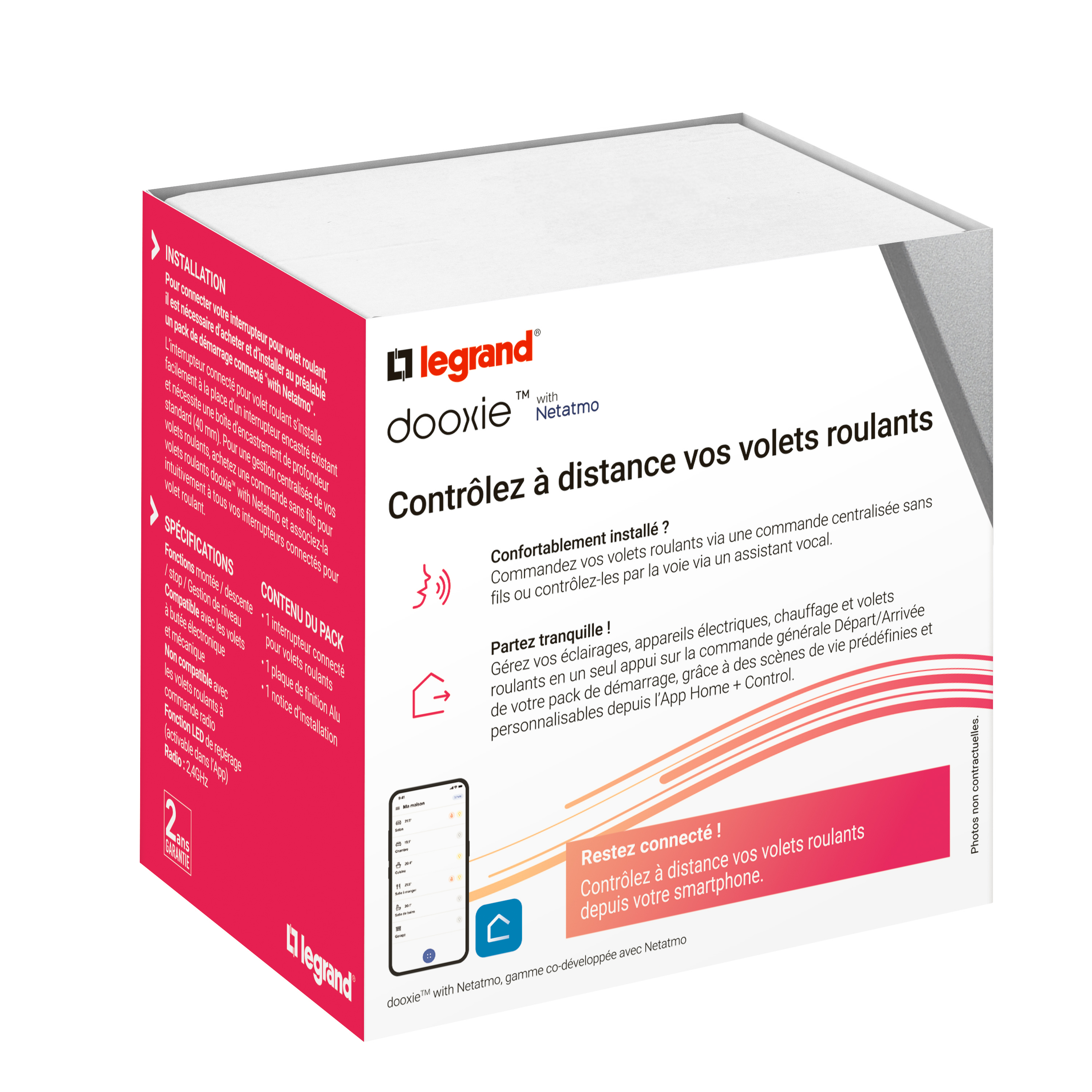 dooxie™ with Netatmo : quand la domotique s’invite chez vous. Le design dooxie™ en plus de la sécurité, la praticité et la facilité de mise en œuvre qu'apporte Netatmo. La version connectée de dooxie permet de contrôler l'éclairage, les volets roulants et les appareils électriques, manuellement par une commande sans fils, un interrupteur ou via la voix avec les assistants vocaux Home d'Apple, Alexa d'Amazon et Google Home et également à distance par un smartphone avec l'App. Home + Control. La mise en œuvre est simple : câblage classique et intuitif avec l'appairage des fonctions.