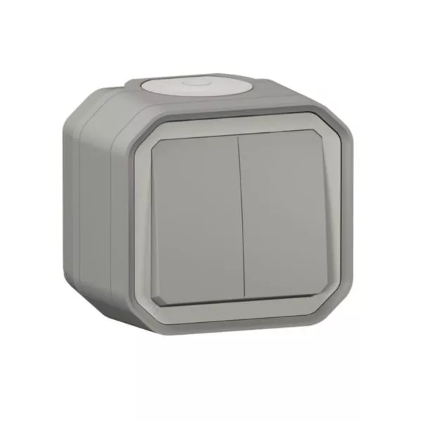Commande pour fonction double interrupteur ou va-et-vient 10A ou poussoir 10A étanche Plexo complet pour montage en apparent gris