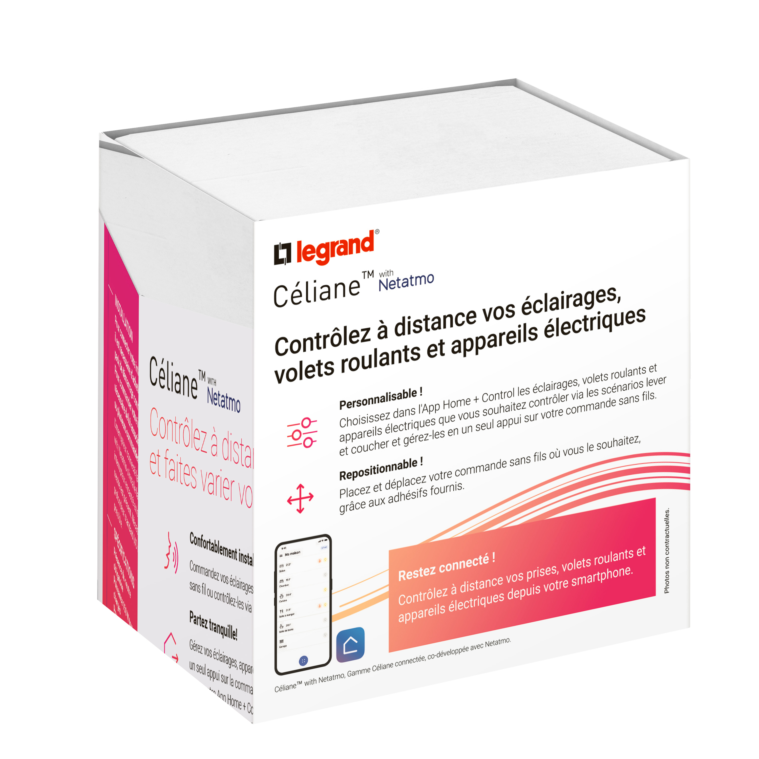 Céliane™ with Netatmo permet d’homogénéiser le design des fonctions connectées dans votre logement avec le reste de votre installation. Reconnaissables grâce au motif effet diamant autour du doigt, les produits connectés Céliane with Netatmo gardent une finition harmonieuse avec les interrupteurs et prises Céliane. La mise en œuvre simple avec un câblage classique et intuitif permet de remplacer facilement vos anciens interrupteurs et prises. La domotique au service de votre quotidien : personnalisez l’usage de votre éclairage, de vos volets roulants, de votre VMC, ou encore de votre chauffage et appareils électriques, suivant vos habitudes de vie. Vous pouvez contrôler votre installation manuellement via une commande sans fils ou un interrupteur, par la voix via les assistants vocaux (Apple Home, Amazon Alexa, Google Home) mais aussi à distance via l'App. Home + Control. Et pour optimiser votre consommation d’énergie, visualisez directement dans l’application vos consommations pour savoir où agir si nécessaire. Les solutions connectées Céliane™ with Netatmo favorisent les économies d’énergie : réduire la consommation d’énergie sans impacter le confort.