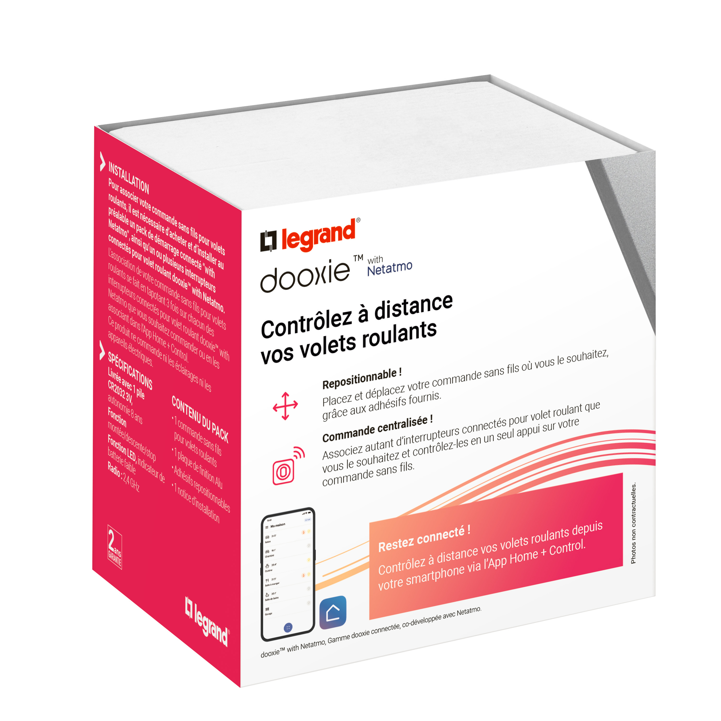 dooxie™ with Netatmo : quand la domotique s’invite chez vous. Le design dooxie™ en plus de la sécurité, la praticité et la facilité de mise en œuvre qu'apporte Netatmo. La version connectée de dooxie permet de contrôler l'éclairage, les volets roulants et les appareils électriques, manuellement par une commande sans fils, un interrupteur ou via la voix avec les assistants vocaux Home d'Apple, Alexa d'Amazon et Google Home et également à distance par un smartphone avec l'App. Home + Control. La mise en œuvre est simple : câblage classique et intuitif avec l'appairage des fonctions.