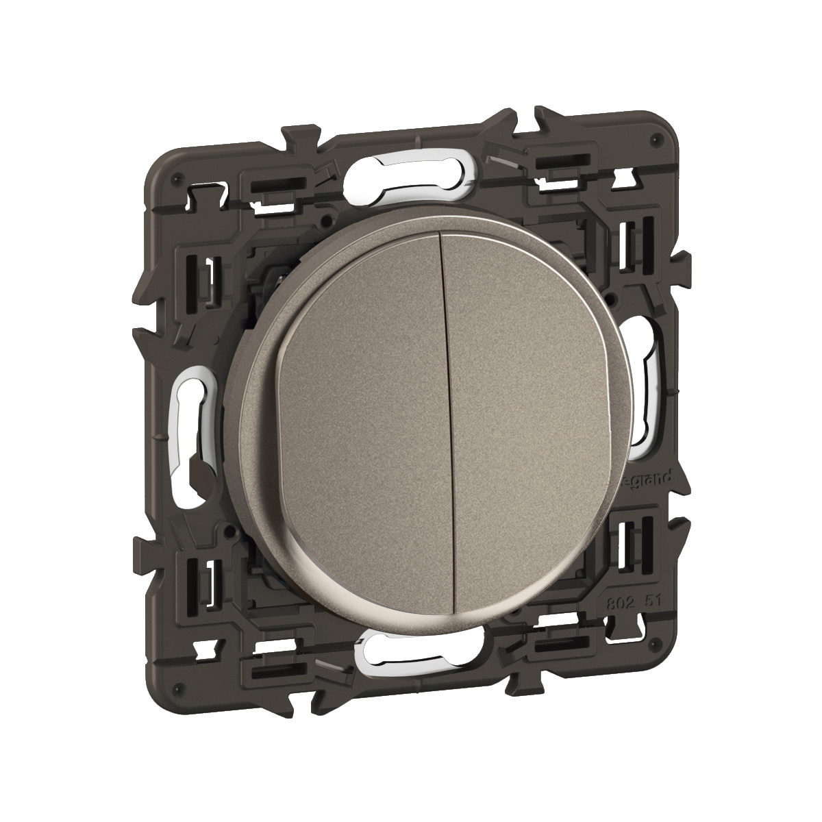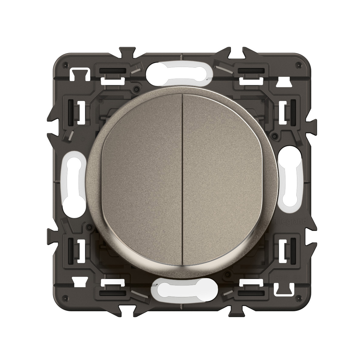 Double interrupteur ou va-et-vient lumineux 10A (voyant fourni) Céliane - Titanium avec support, à équiper d'une plaque