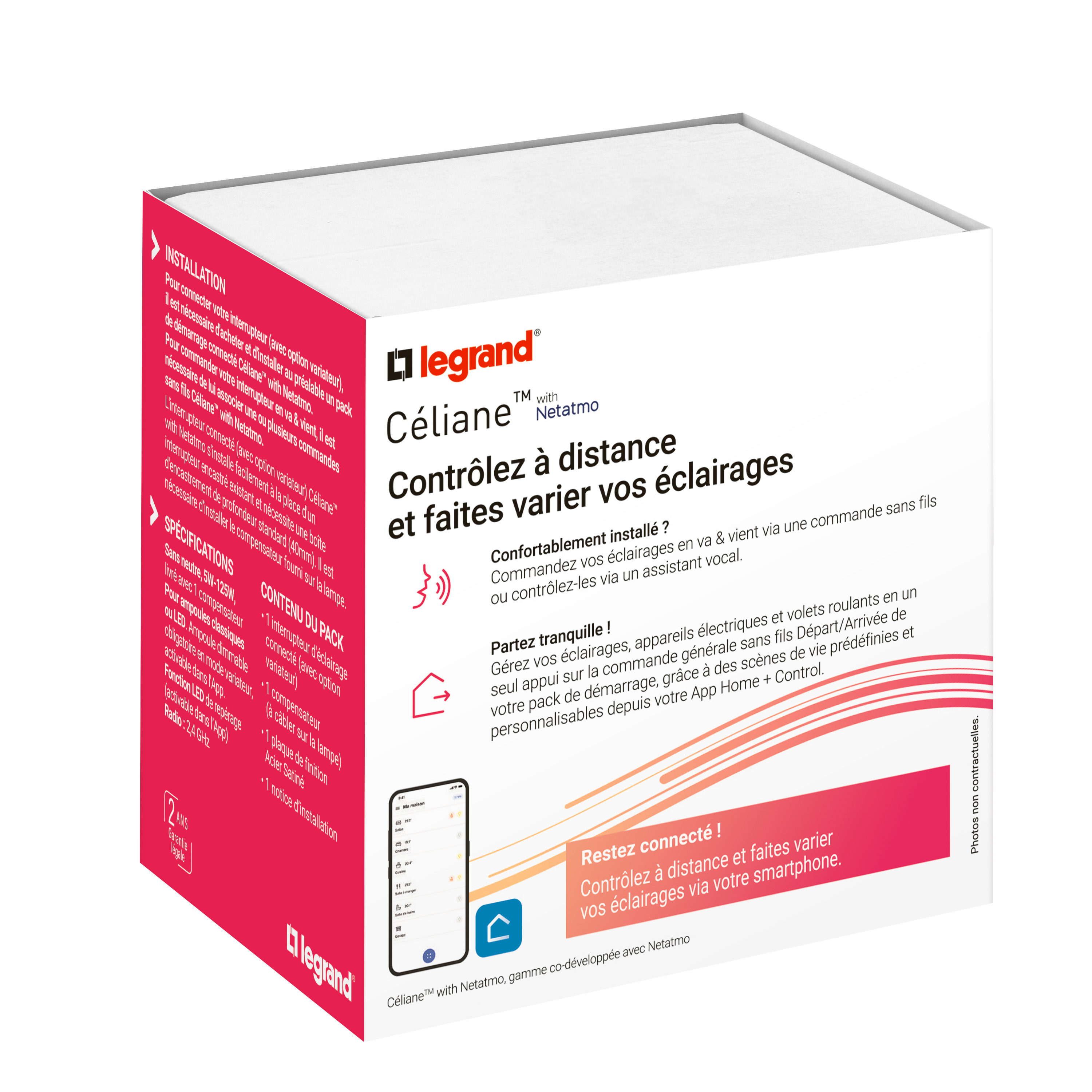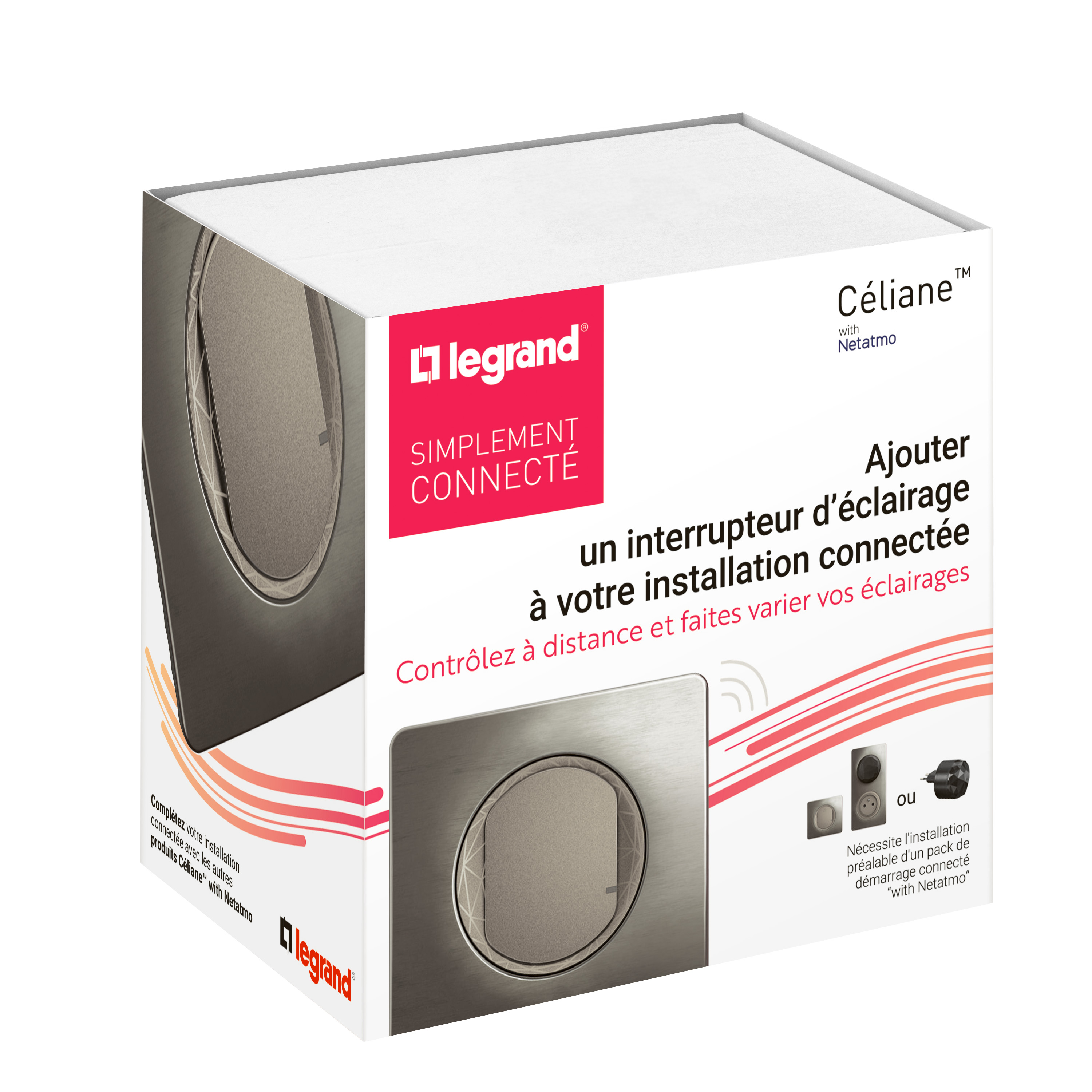 Interrupteur connecté (avec option variation )Céliane with Netatmo permet de contrôler l'éclairage manuellement, à distance via l'App. Home + Control ou par la voix avec un assistant vocal