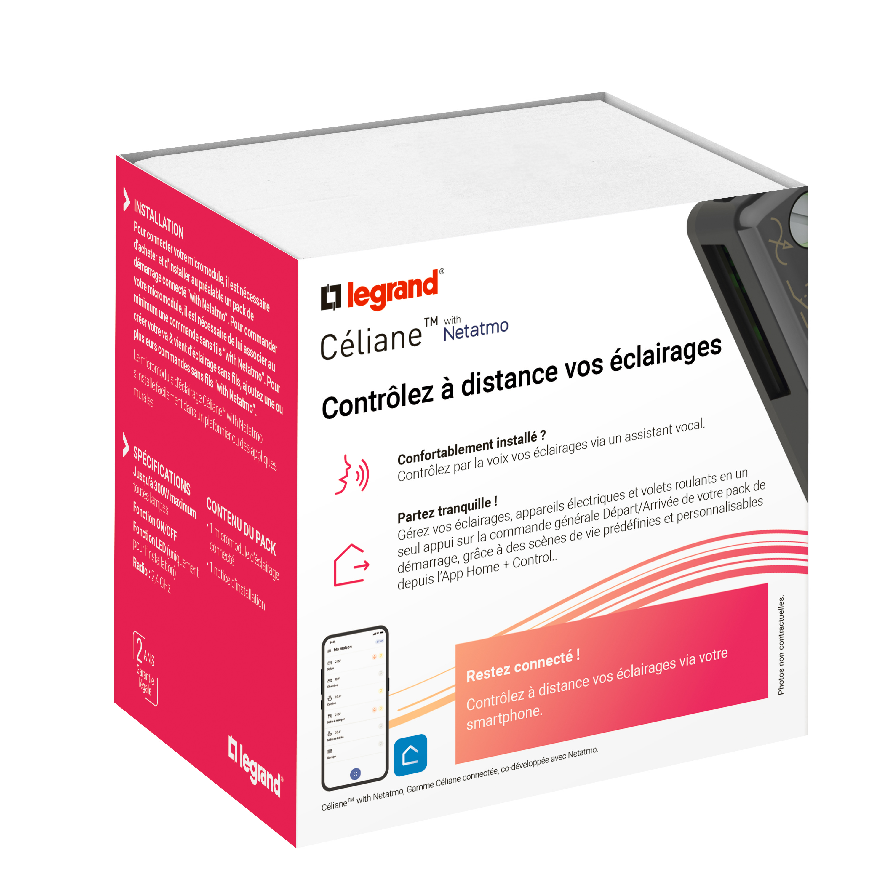 Céliane™ with Netatmo permet d’homogénéiser le design des fonctions connectées dans votre logement avec le reste de votre installation. Reconnaissables grâce au motif effet diamant autour du doigt, les produits connectés Céliane with Netatmo gardent une finition harmonieuse avec les interrupteurs et prises Céliane. La mise en œuvre simple avec un câblage classique et intuitif permet de remplacer facilement vos anciens interrupteurs et prises. La domotique au service de votre quotidien : personnalisez l’usage de votre éclairage, de vos volets roulants, de votre VMC, ou encore de votre chauffage et appareils électriques, suivant vos habitudes de vie. Vous pouvez contrôler votre installation manuellement via une commande sans fils ou un interrupteur, par la voix via les assistants vocaux (Apple Home, Amazon Alexa, Google Home) mais aussi à distance via l'App. Home + Control. Et pour optimiser votre consommation d’énergie, visualisez directement dans l’application vos consommations pour savoir où agir si nécessaire. Les solutions connectées Céliane™ with Netatmo favorisent les économies d’énergie : réduire la consommation d’énergie sans impacter le confort.