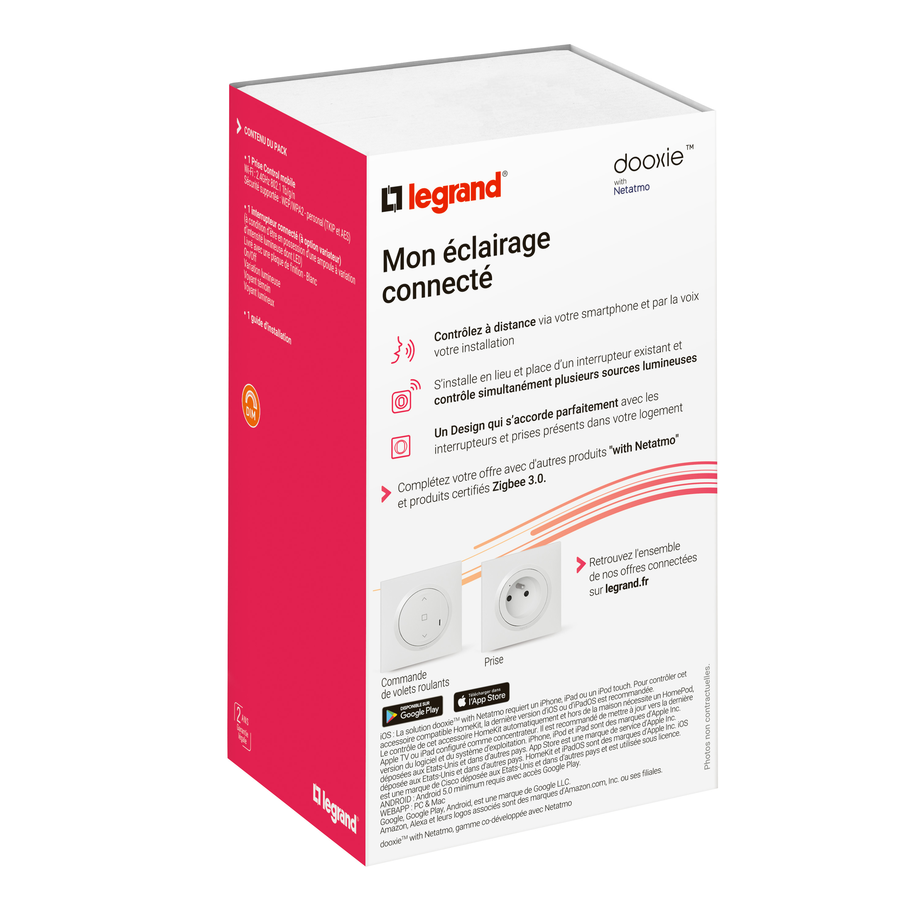 - Le pack de démarrage éclairage connecté dooxie with Netatmo permet de démarrer une installation connectée dans le logement via le réseau Wi-Fi de la box internet - Facile et rapide à installer, il vous permet de piloter l'éclairage via l'interrupteur variateur, l'App Home + Control, ou la voix grâce aux assistants vocaux - Ce pack est composé d'une Prise Control mobile à brancher directement dans une prise de courant et d'un interrupteur variateur sans Neutre à câbler en remplacement d'un interrupteur traditionnel
