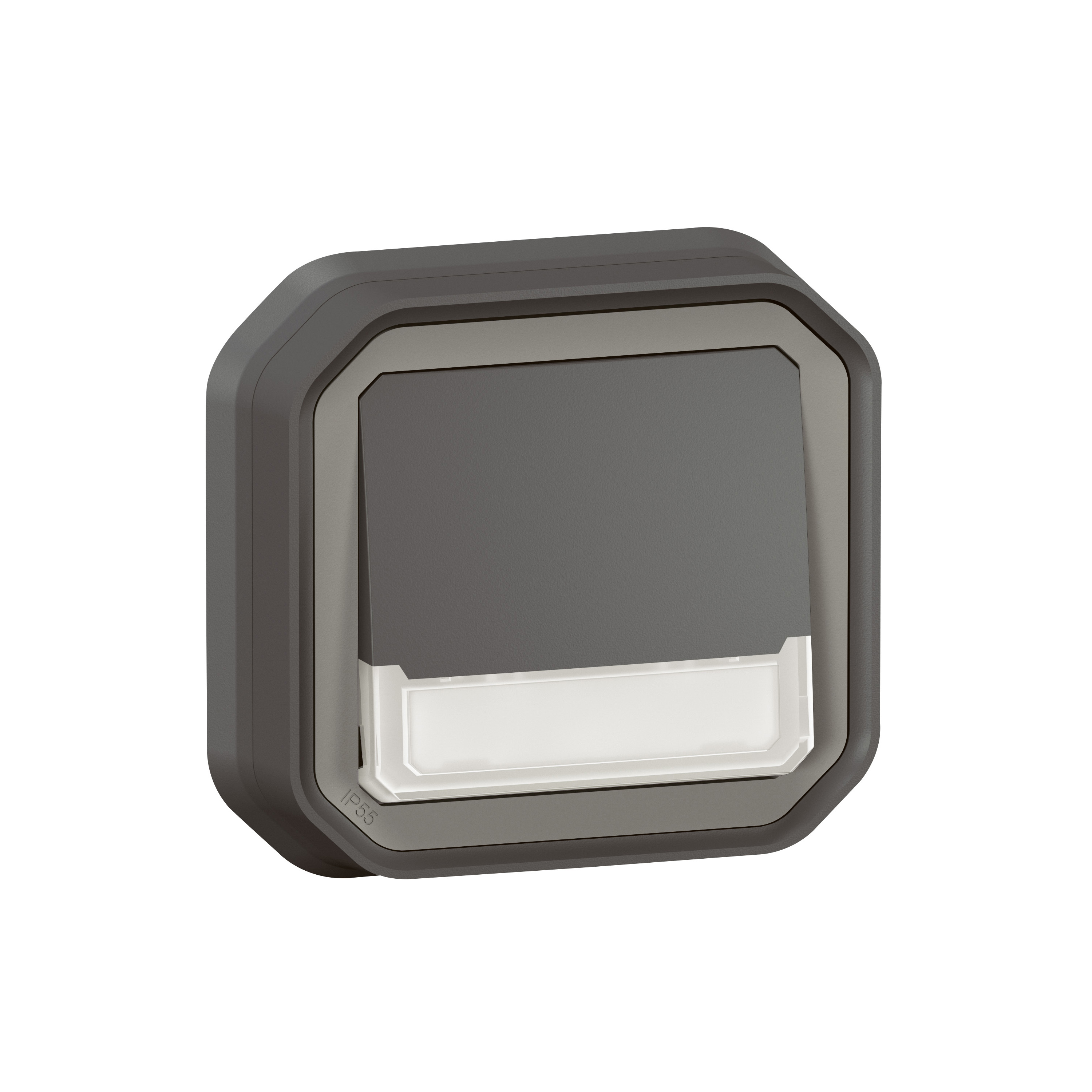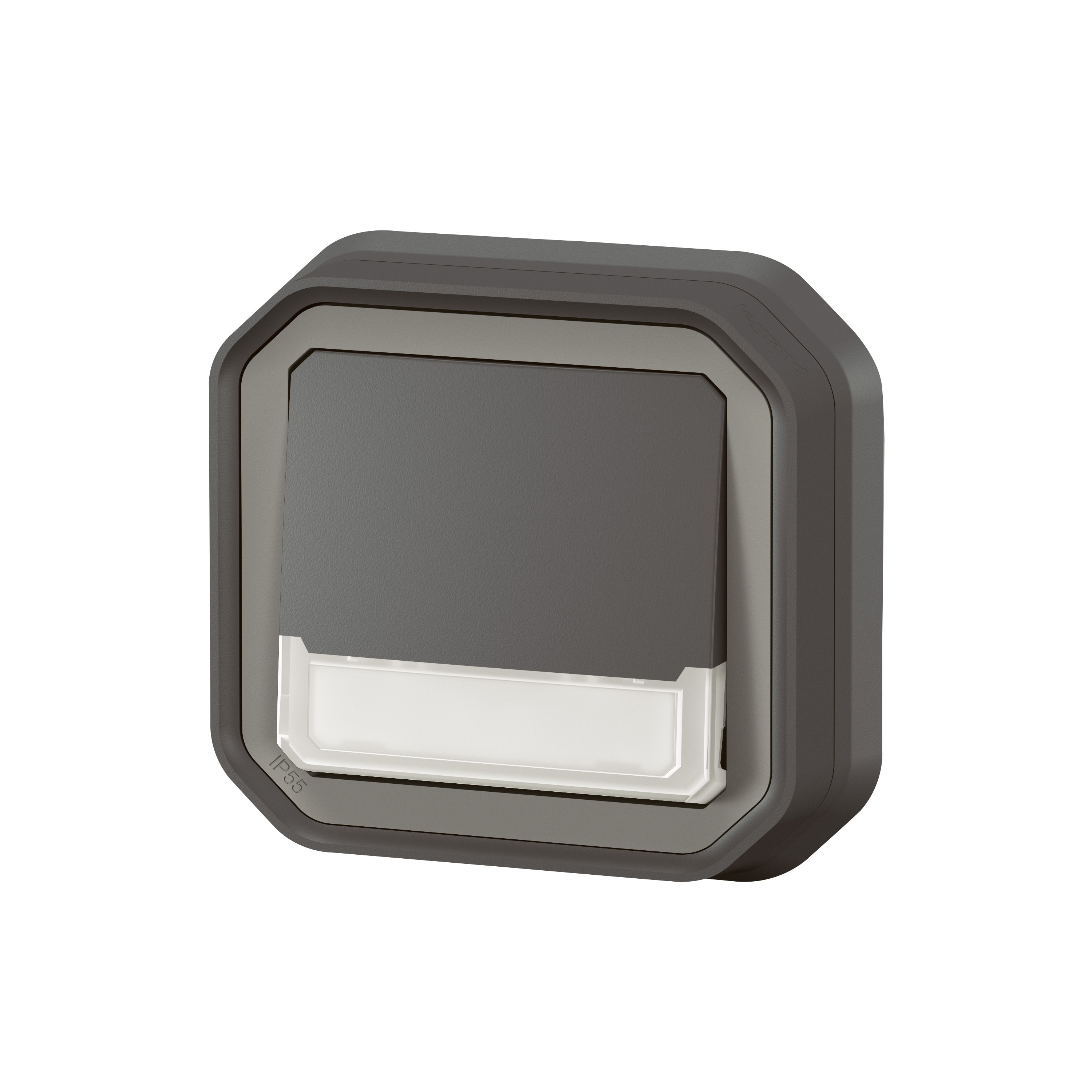 Poussoir inverseur lumineux étanche avec porte-étiquette Plexo livré complet pour montage en encastré Anthracite