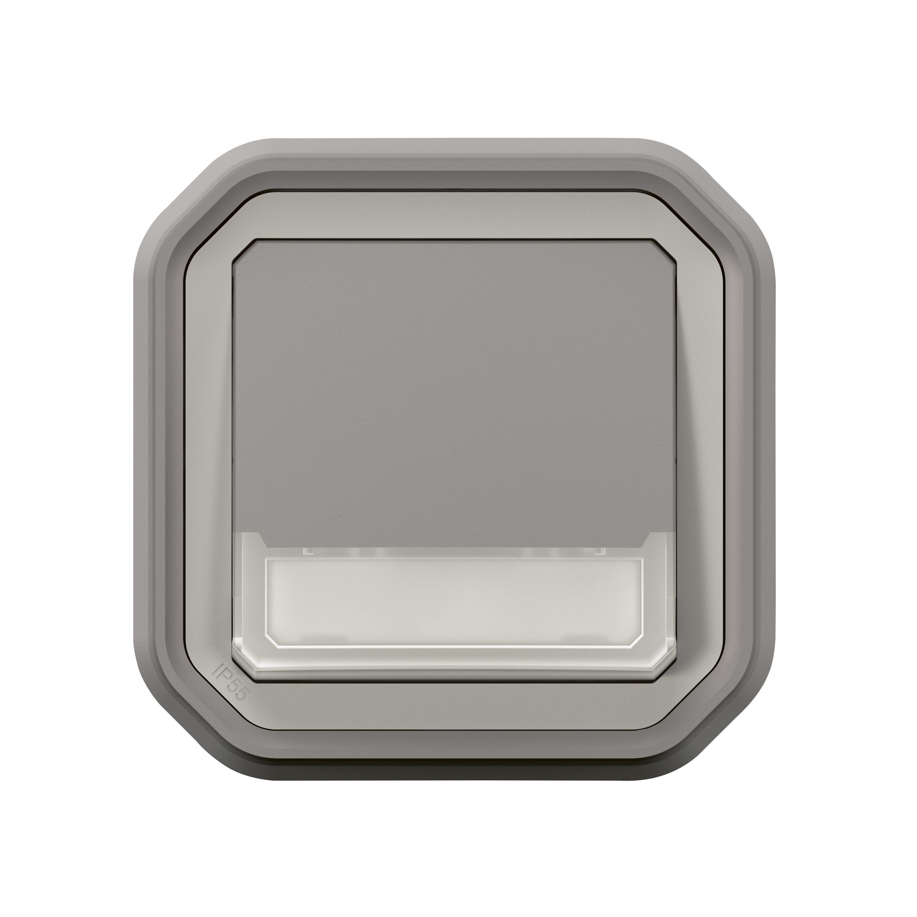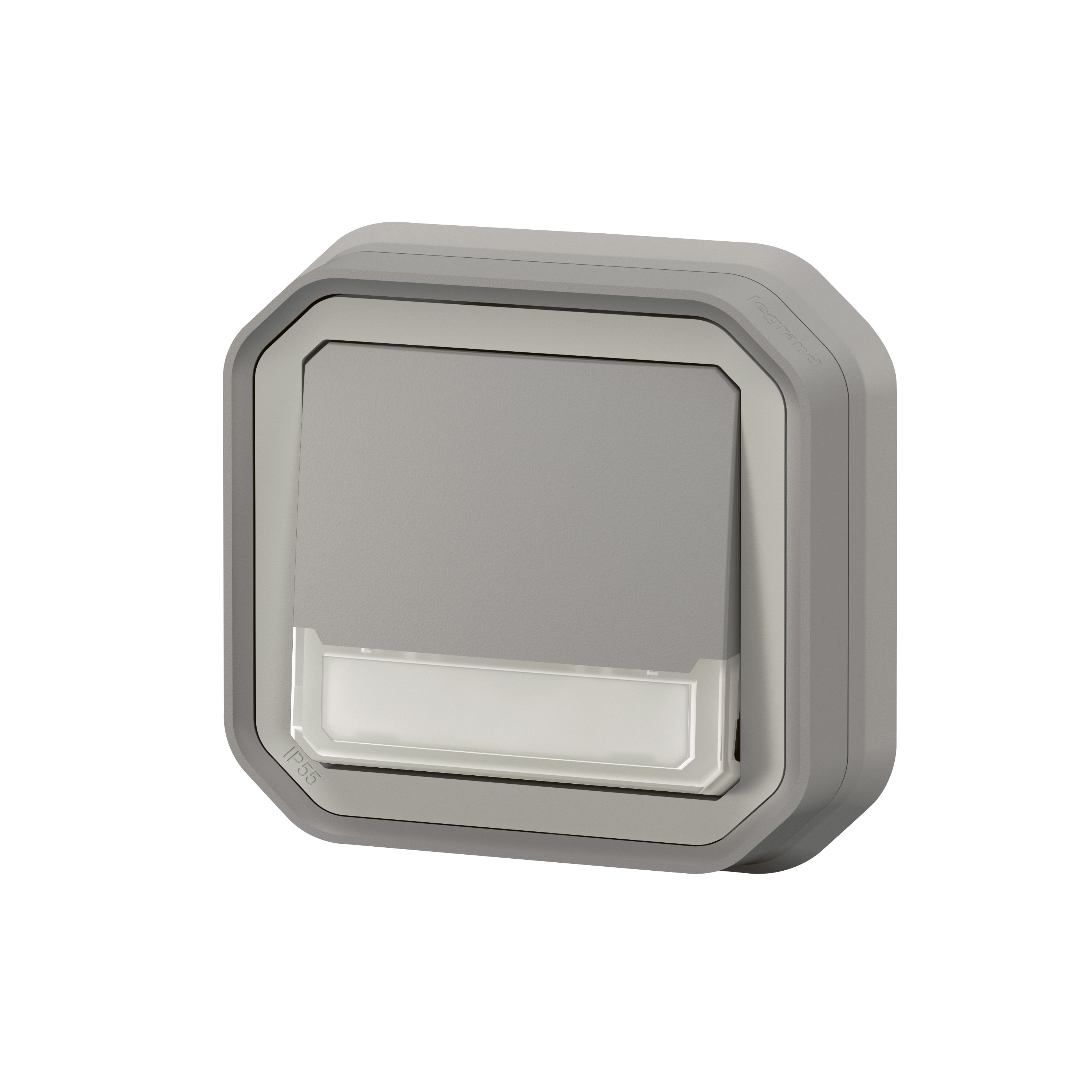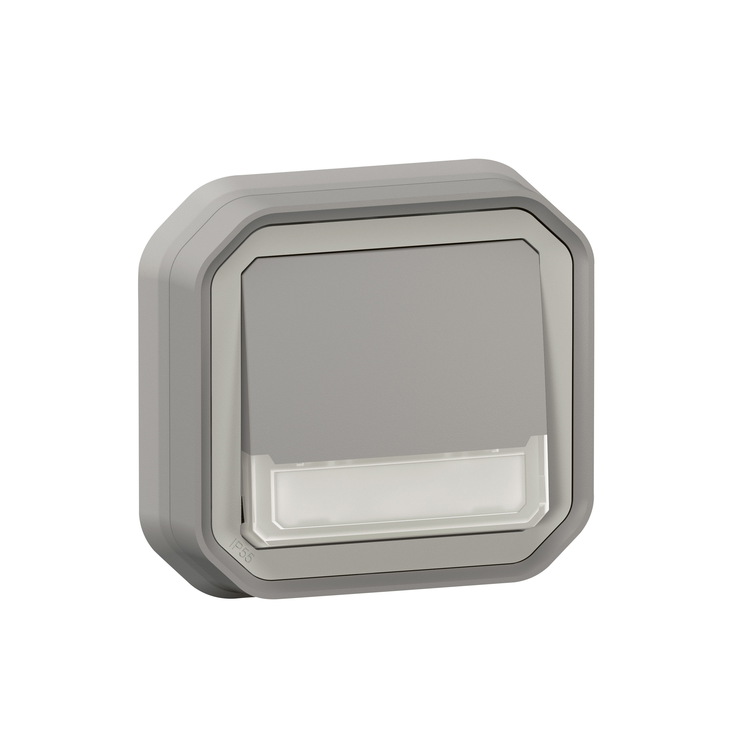 Poussoir inverseur lumineux étanche avec porte-étiquette Plexo livré complet pour montage en encastré Gris