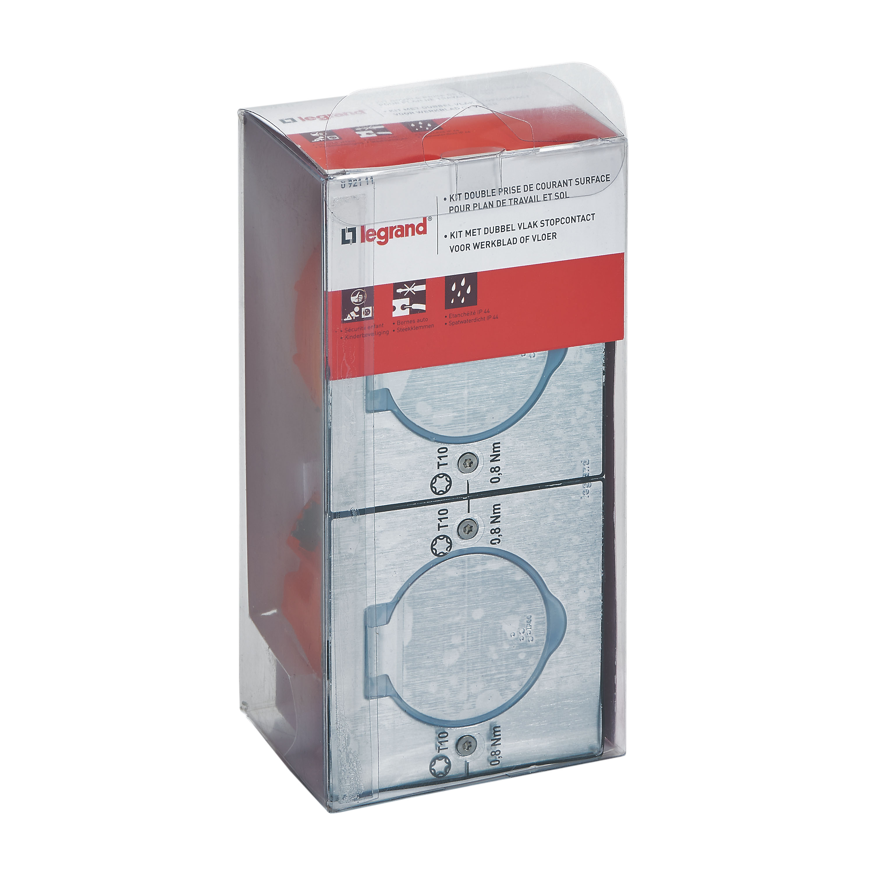 Ces deux prises de courant protégées chacune par un volet permettent le branchement de deux appareils électriques ou électroniques au sol, sur un plan de travail ou au mur.