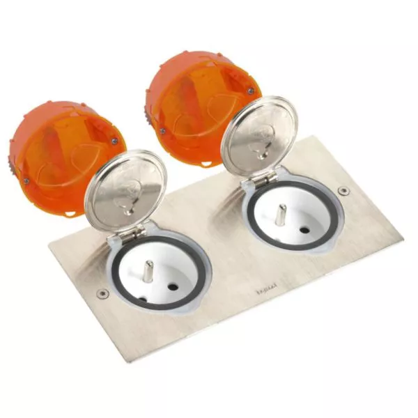 Kit double prise de sol et plan de travail inox étanche IP44 clapet de protection + boite à encastrer