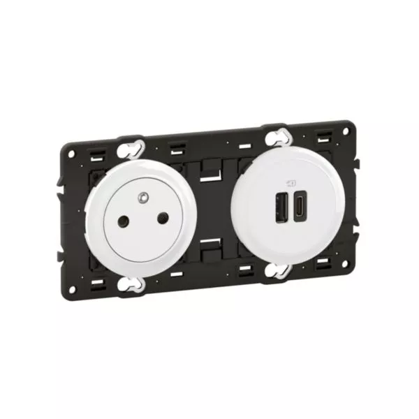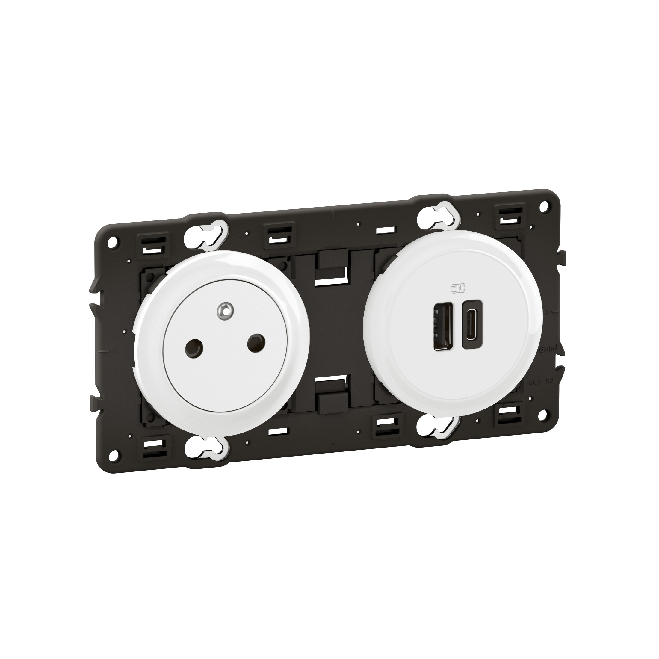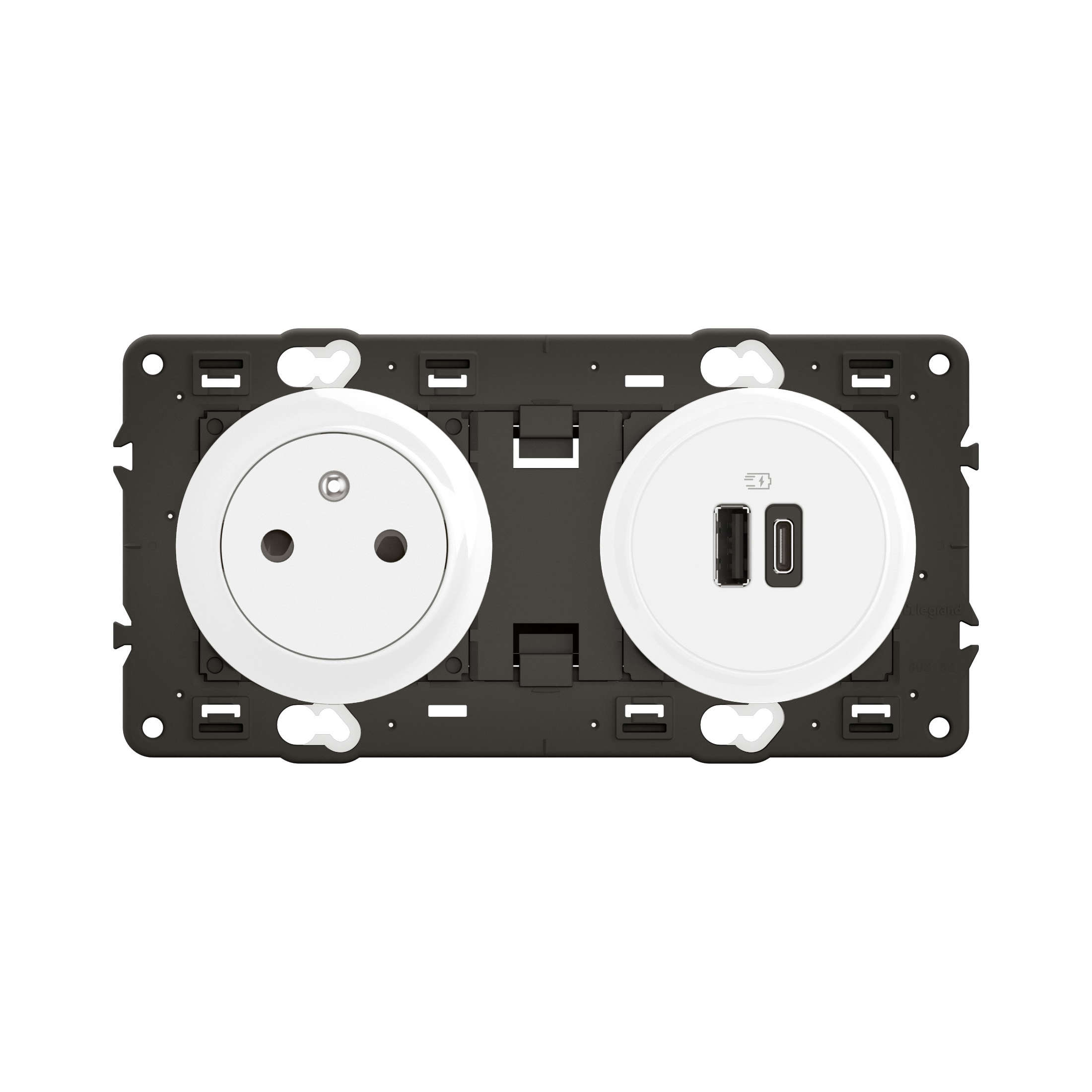 Prise 2P+T Surface Confort Céliane et prise USB Type-A + Type-C 15W précâblées - Blanc avec support, à équiper d'une plaque
