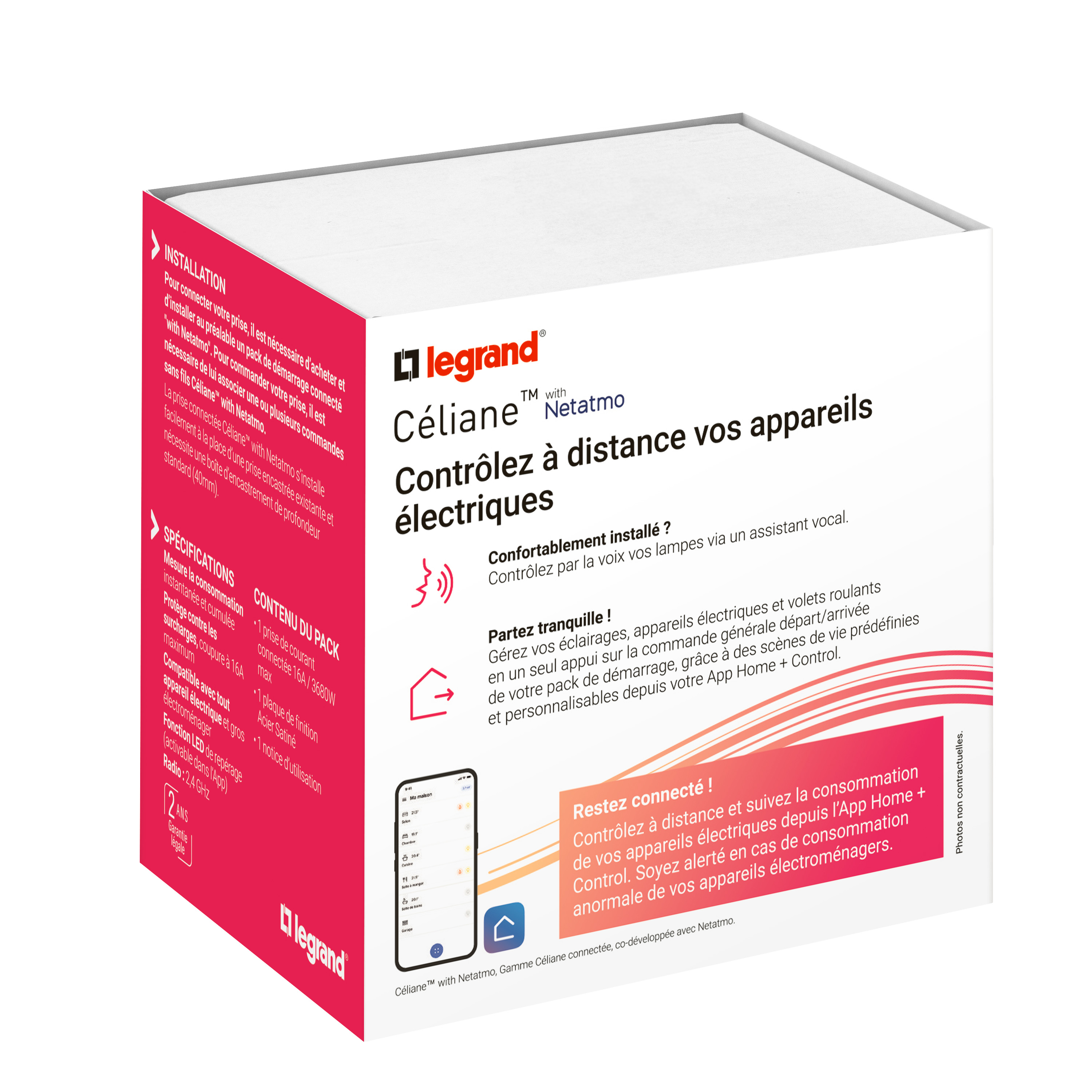 Céliane™ with Netatmo permet d’homogénéiser le design des fonctions connectées dans votre logement avec le reste de votre installation. Reconnaissables grâce au motif effet diamant autour du doigt, les produits connectés Céliane with Netatmo gardent une finition harmonieuse avec les interrupteurs et prises Céliane. La mise en œuvre simple avec un câblage classique et intuitif permet de remplacer facilement vos anciens interrupteurs et prises. La domotique au service de votre quotidien : personnalisez l’usage de votre éclairage, de vos volets roulants, de votre VMC, ou encore de votre chauffage et appareils électriques, suivant vos habitudes de vie. Vous pouvez contrôler votre installation manuellement via une commande sans fils ou un interrupteur, par la voix via les assistants vocaux (Apple Home, Amazon Alexa, Google Home) mais aussi à distance via l'App. Home + Control. Et pour optimiser votre consommation d’énergie, visualisez directement dans l’application vos consommations pour savoir où agir si nécessaire. Les solutions connectées Céliane™ with Netatmo favorisent les économies d’énergie : réduire la consommation d’énergie sans impacter le confort.