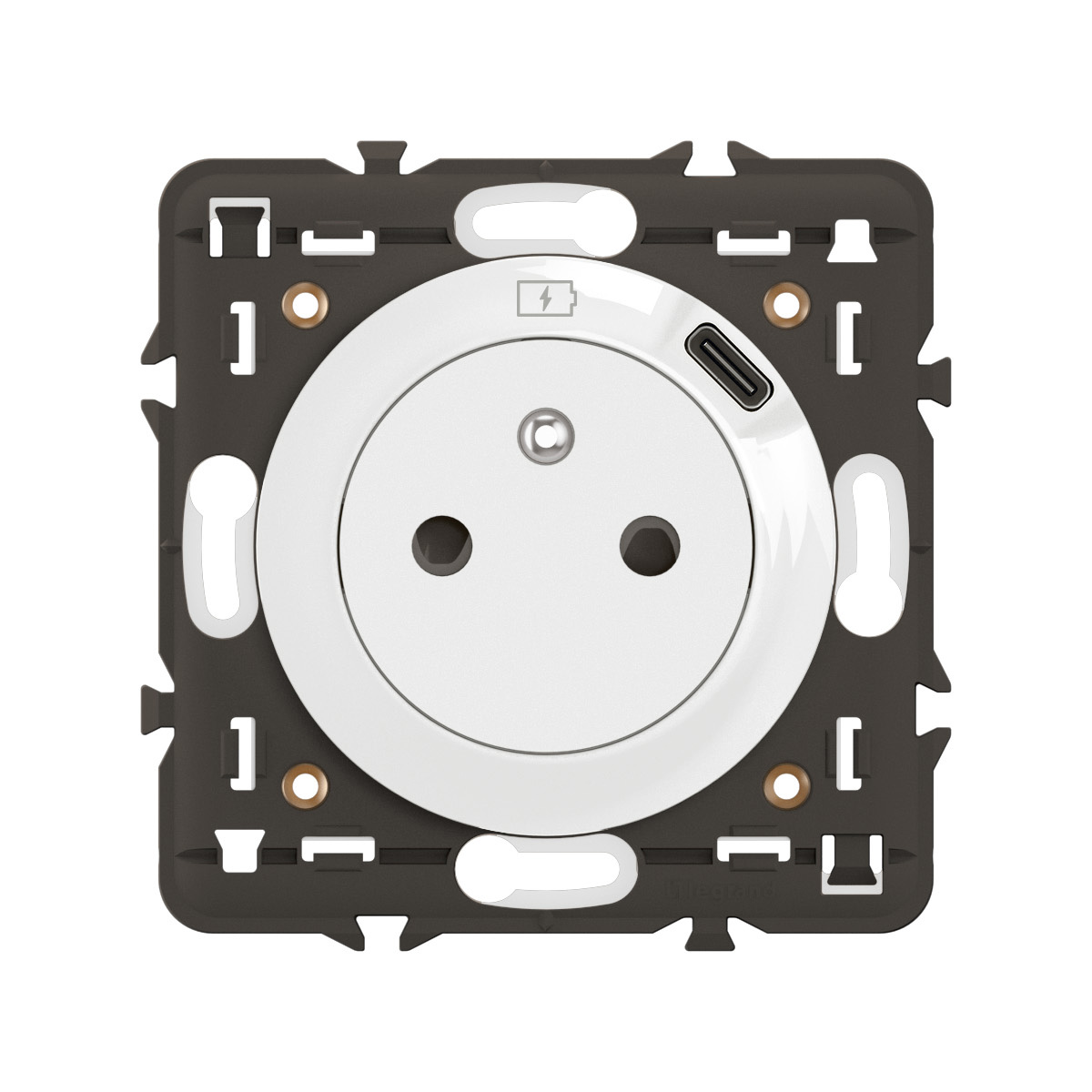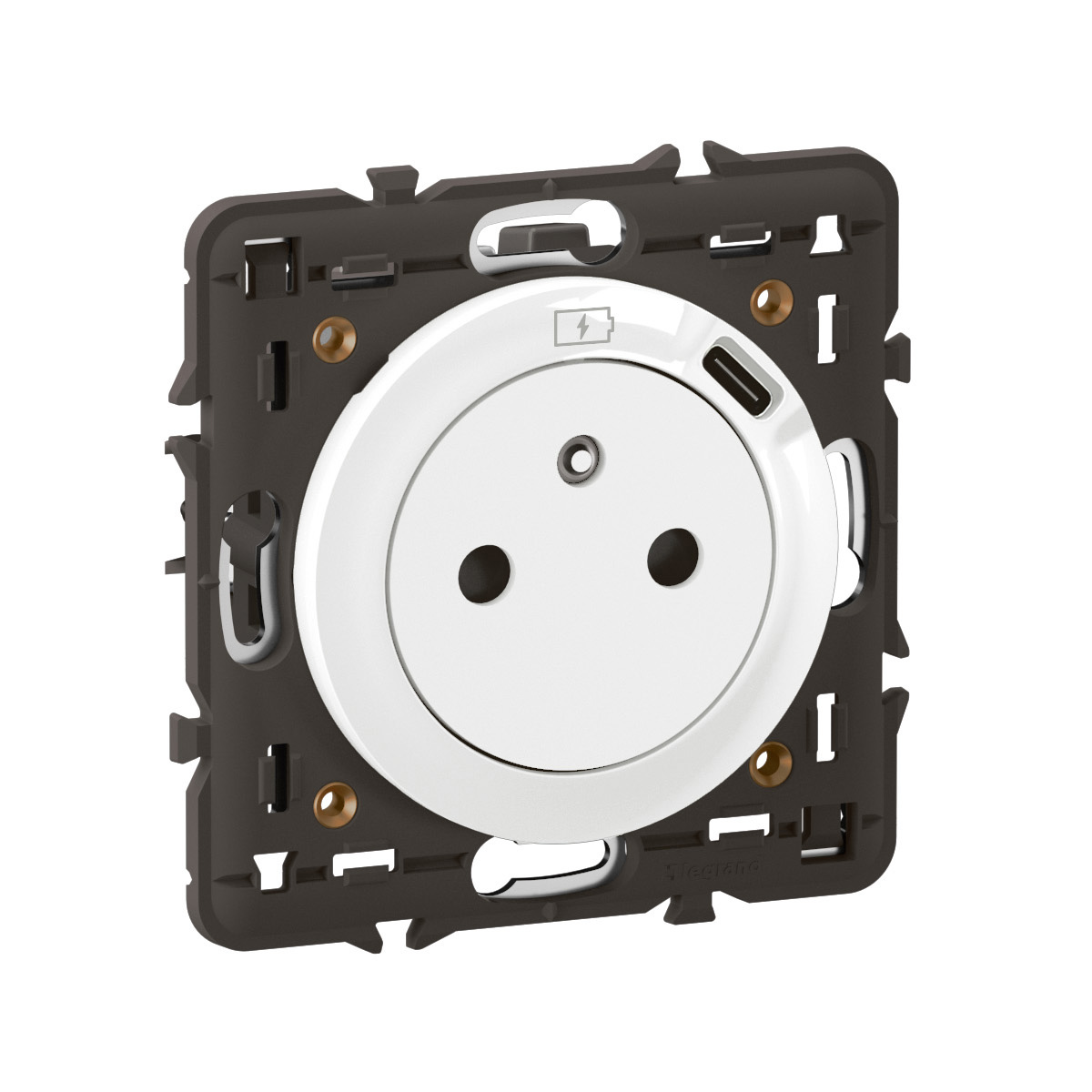 Prise de courant 2P+T Surface Confort avec prise USB Type-C intégrée Céliane - Blanc avec support, à équiper d'une plaque