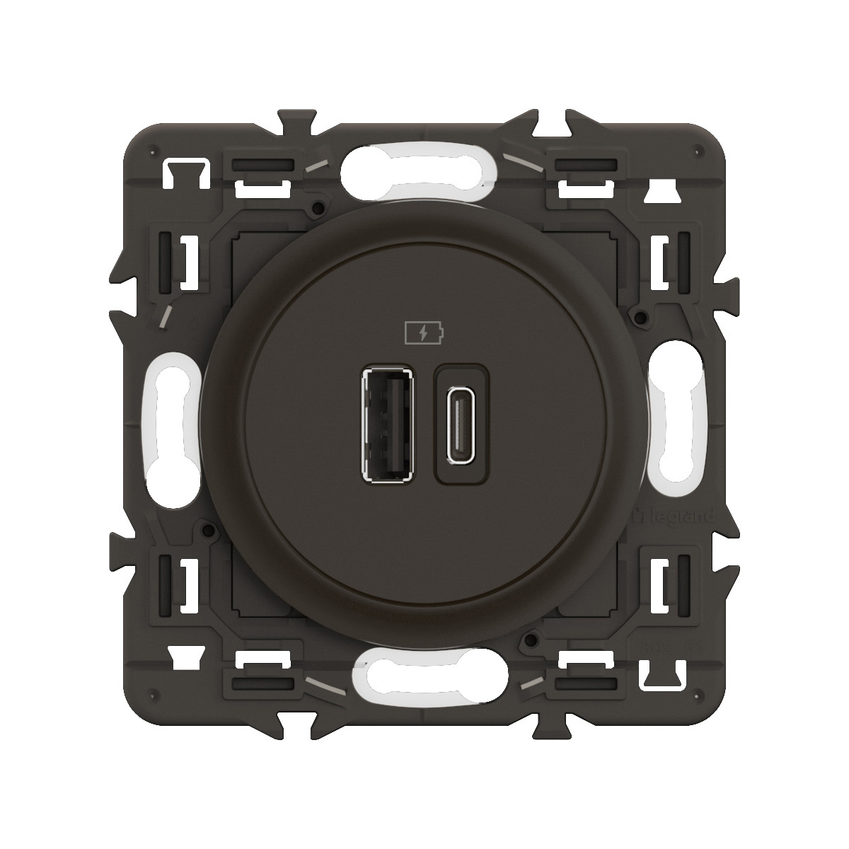 Prise double USB Céliane 15W Type-A + Type-C - Noir avec support, à équiper d'une plaque