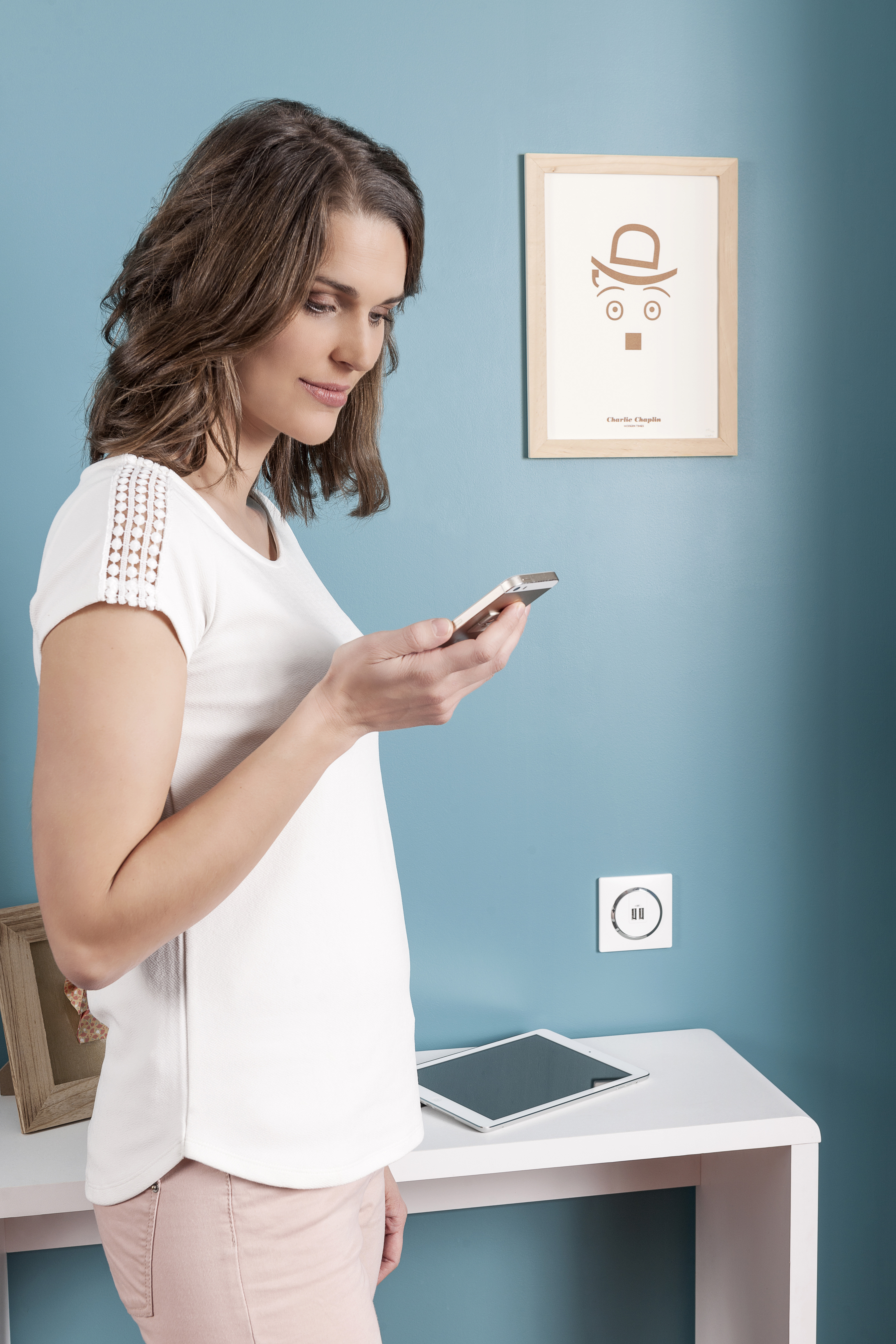 dooxie, un chargeur USB, équipé d'un support et à compléter d'une plaque, avec un design simple et moderne dans l'air du temps