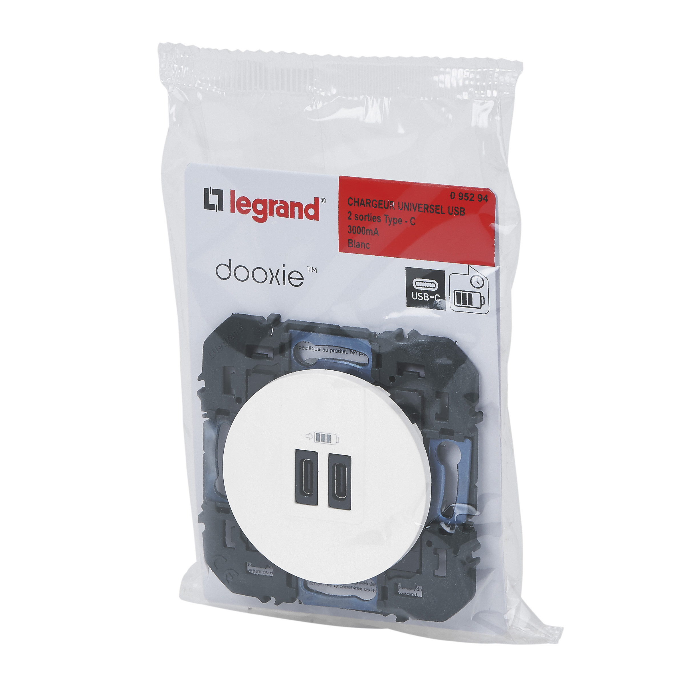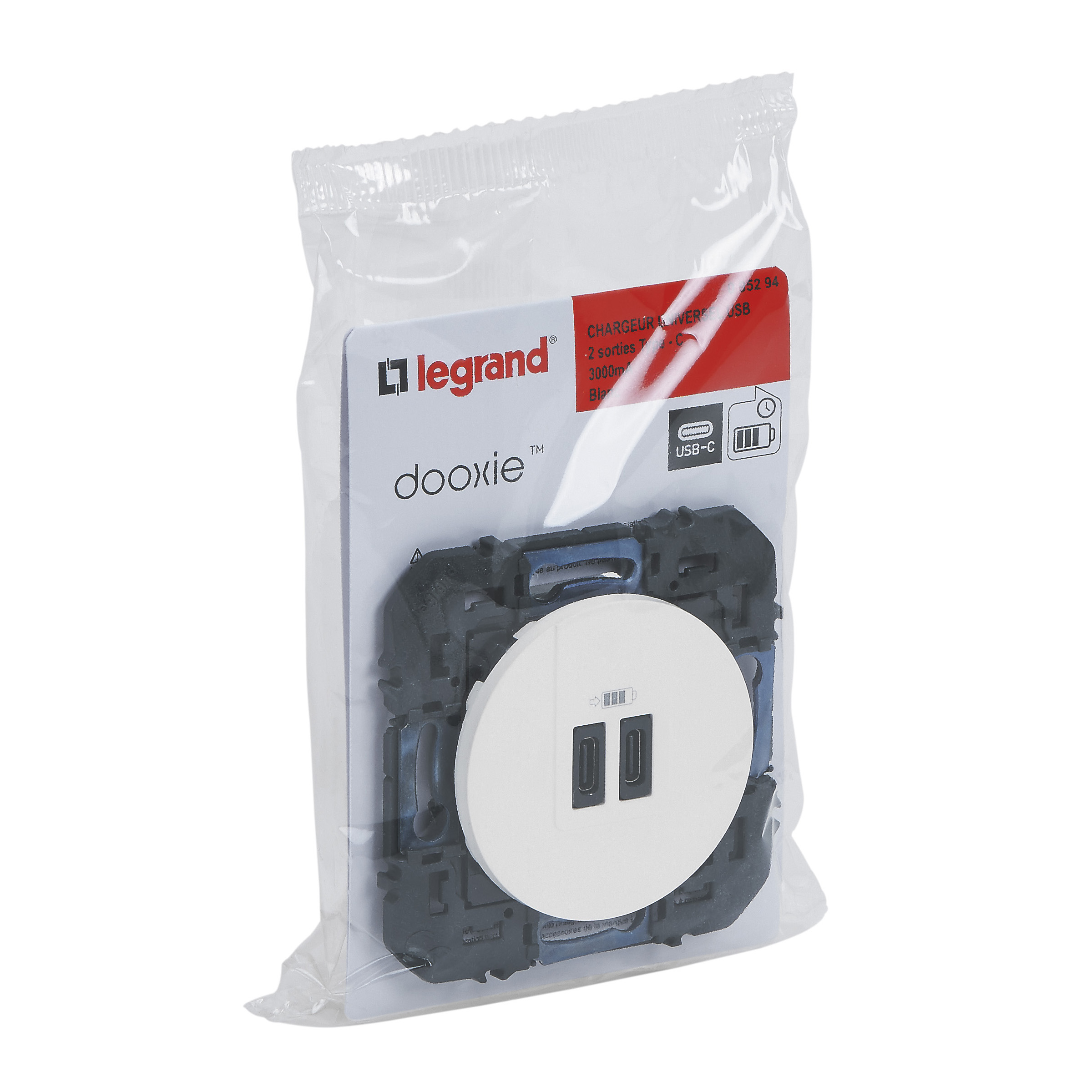 Prise double USB Type-C dooxie 3A 15W finition blanc, à équiper d'une plaque de finition - emballage blister