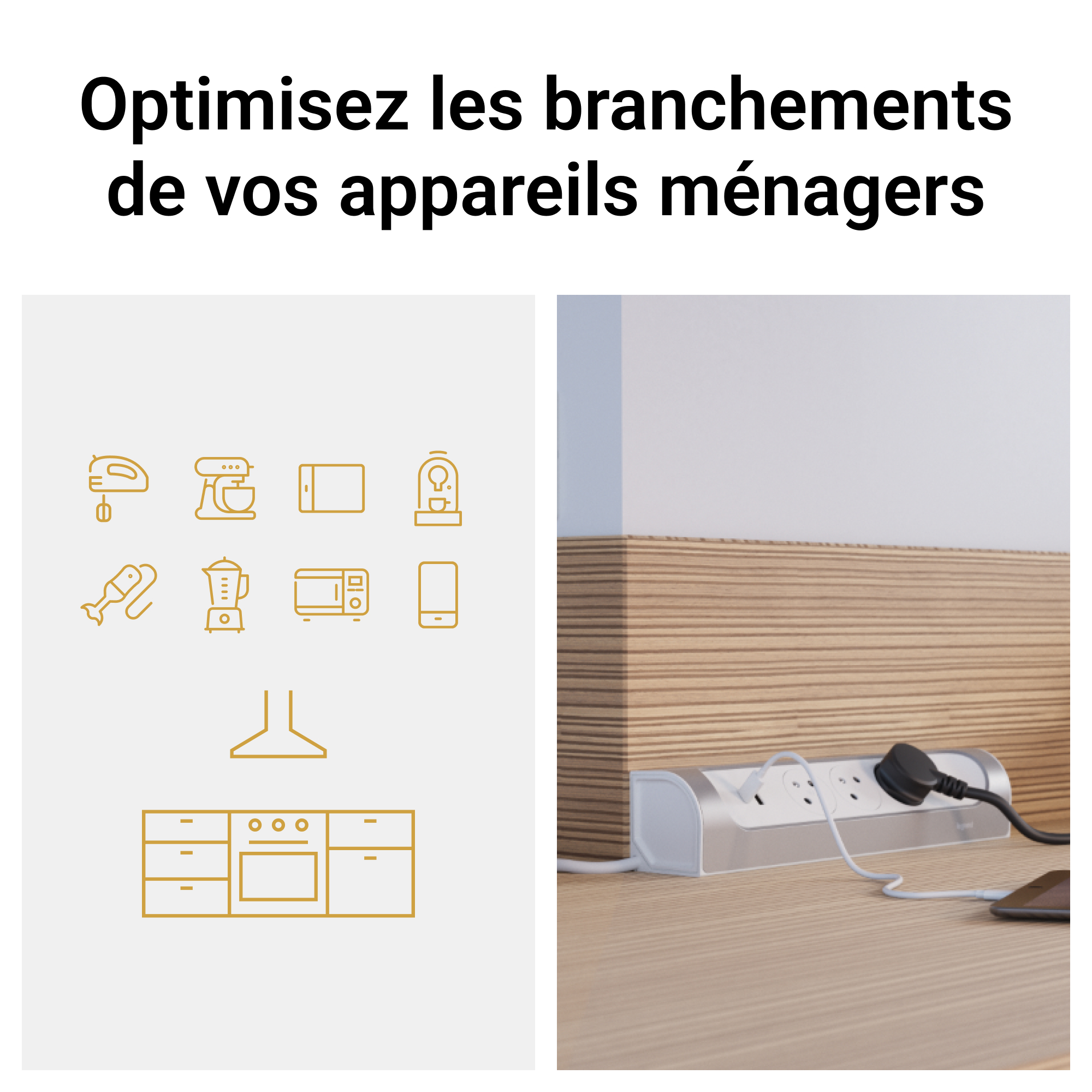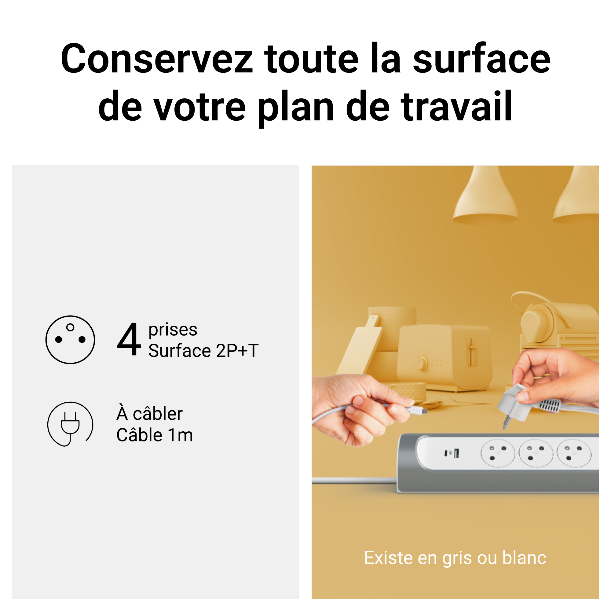 Rallonge multiprise à fixer en angle permettant une optimisation de la place, idéale pour un bureau ou un plan de travail de cuisine