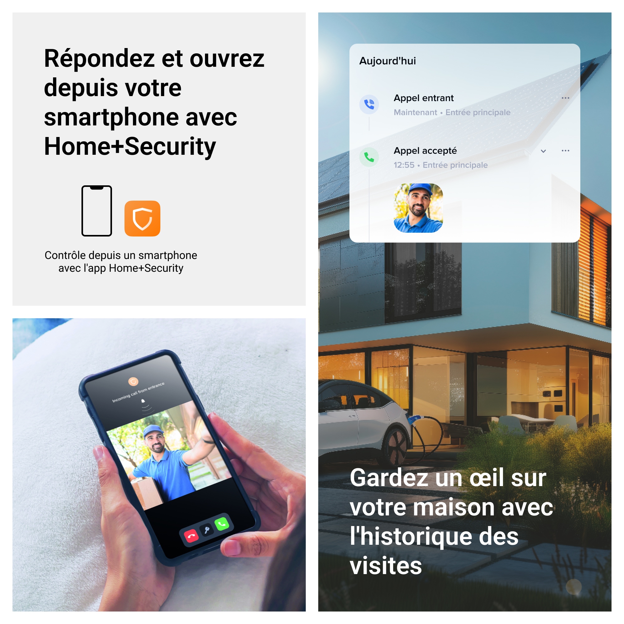 - Pilotez à distance avec l'App. Home + Security les principales fonctions du portier (réponse à un appel, ouverture de porte, vison des caméras)