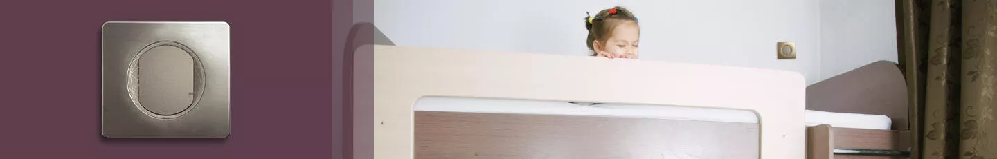 Idéale dans la chambre, fixée au mur ou posée sur la table de chevet, la commande sans fils Lever/Coucher permet de créer des scènes de vie pour le matin et le soir. Un simple appui suffit pour éteindre les lumières, arrêter certains appareils électriques ou baisser les volets roulants de toute la maison.