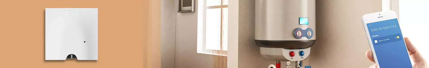 Depuis les paramètres appuyez sur « Planning » puis sur « Actions. » Configurez votre action en indiquant l'heure de début, le ou les jours concernés, le nom de l'action et son type (par exemple allumage du sèche-serviette), puis validez. Votre action est enregistrée. Répétez l'opération pour configurer l'extinction de l'appareil. Consultez en direct les consommations de l'appareil relié à la sortie de câble en appuyant sur l'histogramme en haut de l'écran.