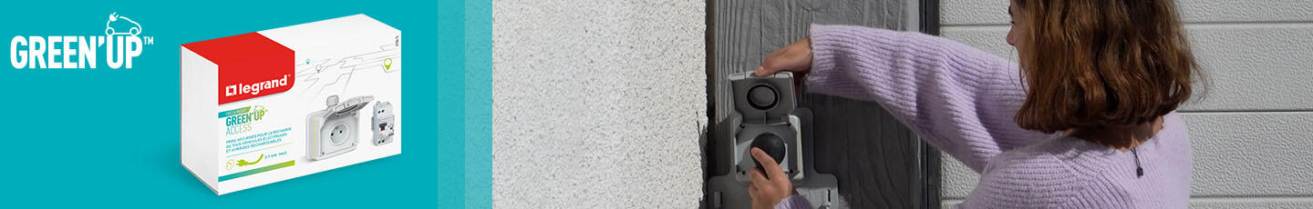 Le prêt-à-poser GREEN'UP ACCESS comprend une prise renforcée GREEN'UP, une patère de suspension et un disjoncteur différentiel 20 A / 30 mA type F.