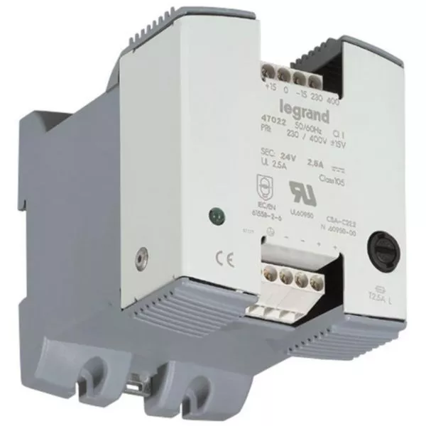 - d'un voyant vert présence tension d'utilisation - Conforme à la norme IEC EN 61558-2-6 et aux normes UL 60950 et CAN/CSA-C22.2 N°60 950.00 jusqu'à 240W - Produit adapté à la réalisation d'équipements conformes aux normes EN 61131-2, EN 60204 et EN 61439-1 - Agrément UL pour USA et Canada