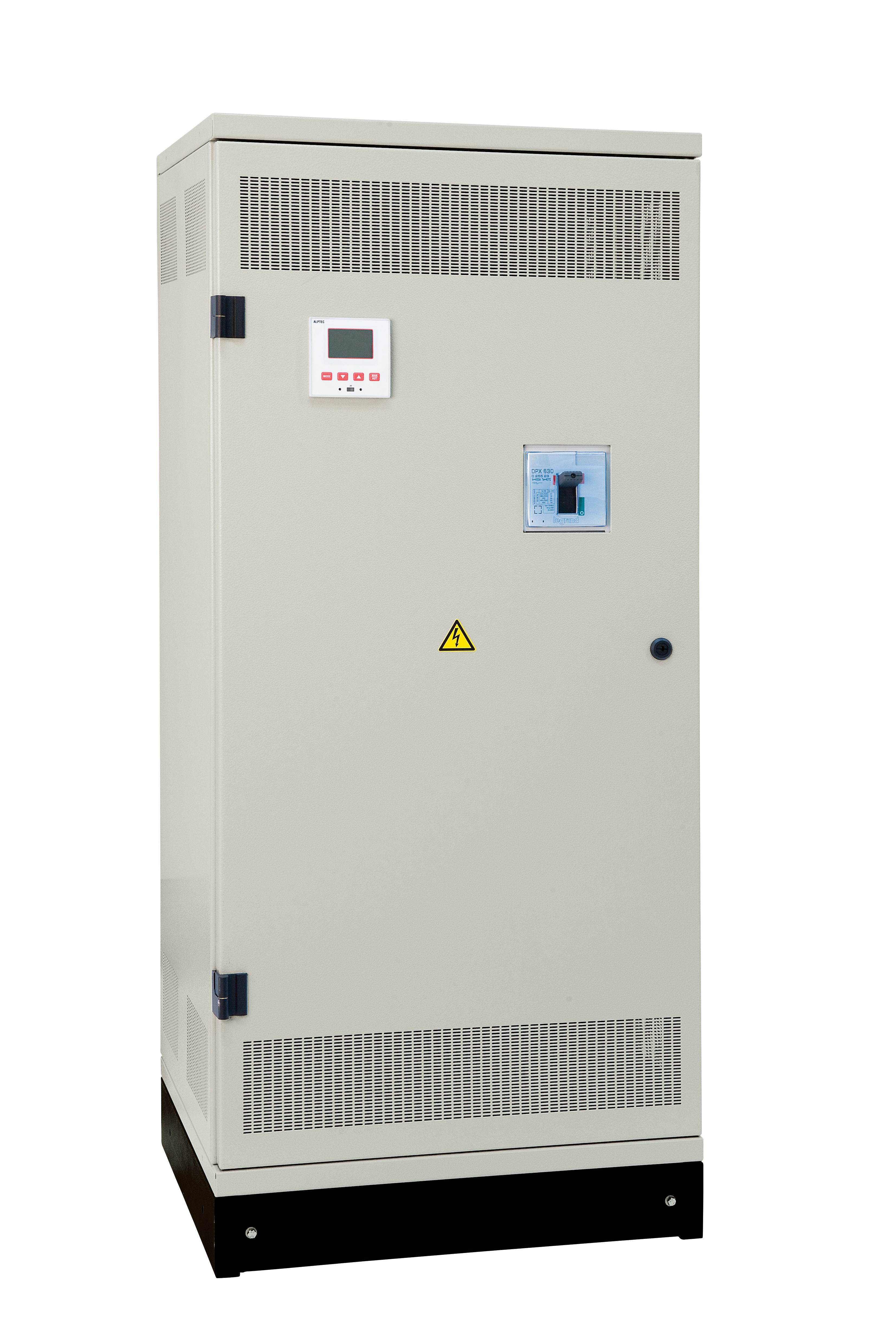 Batterie de condensateurs automatiques à commutation par contacteurs électromécaniques, pilotée par un régulateur varmétrique intégré en armoire pour réseau triphasé avec disjoncteur intégré