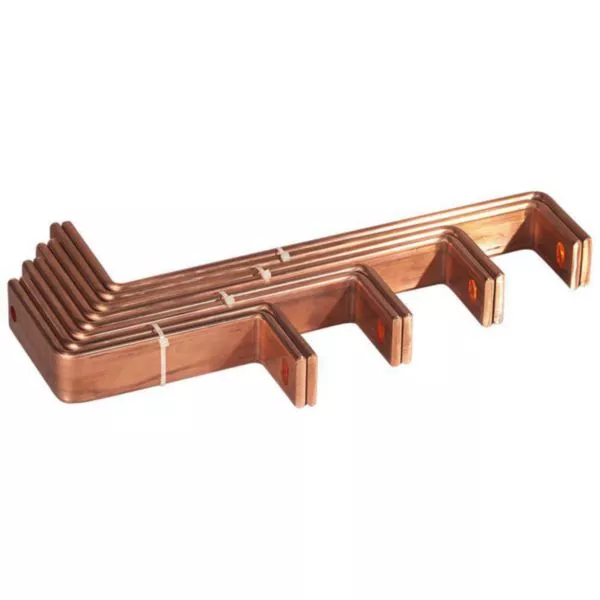 - Barres cuivre pliées et percées pour le raccordement aval des appareils sur jeu de barres aluminium horizontal de transfert, entraxe 75mm