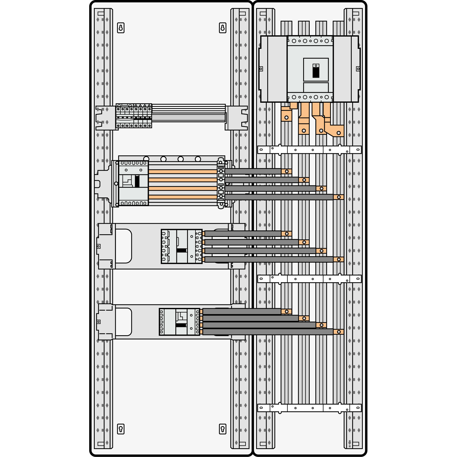 - Barres cuivres rigides préparées pour le raccordement des appareils sur le jeu de barres alu 800A VX³