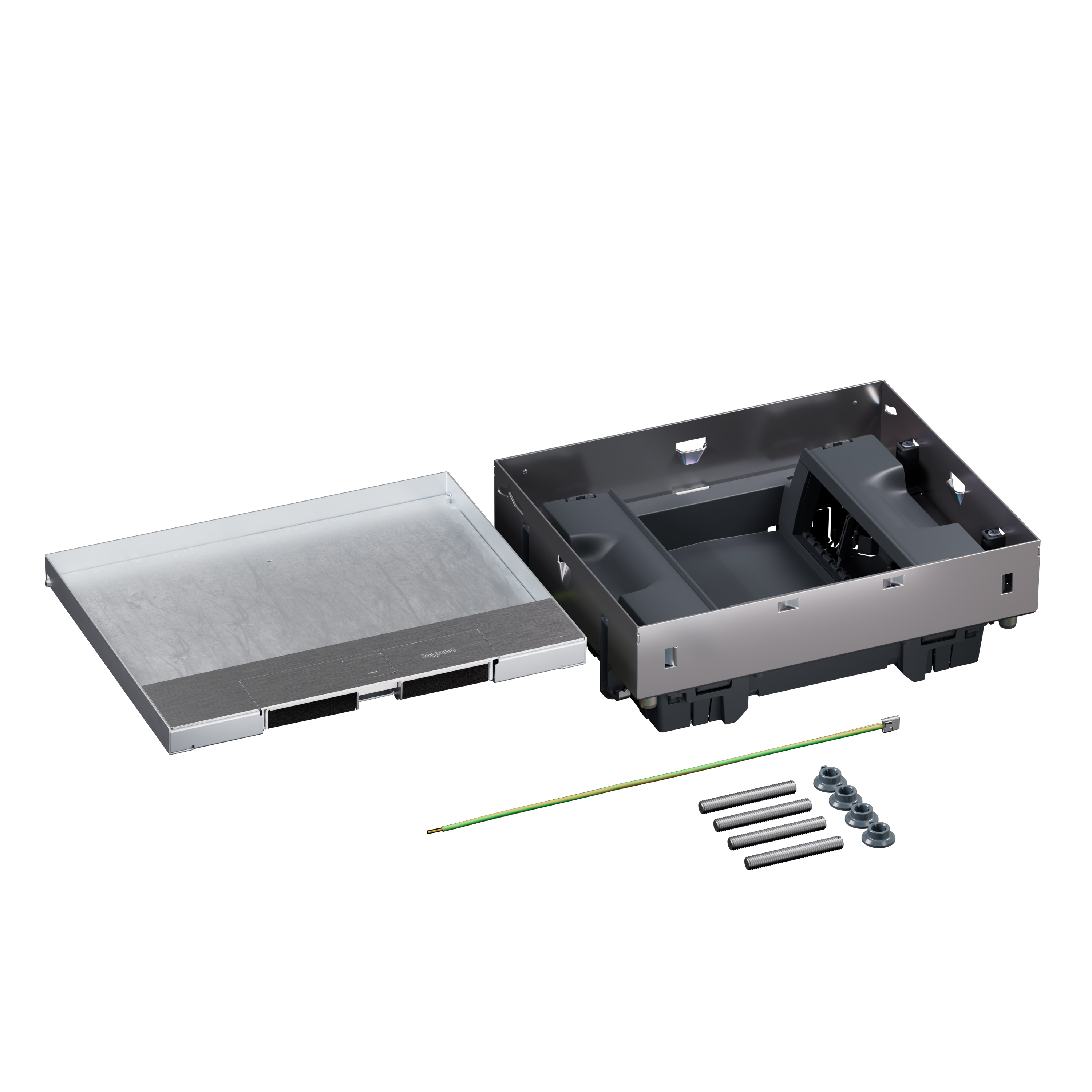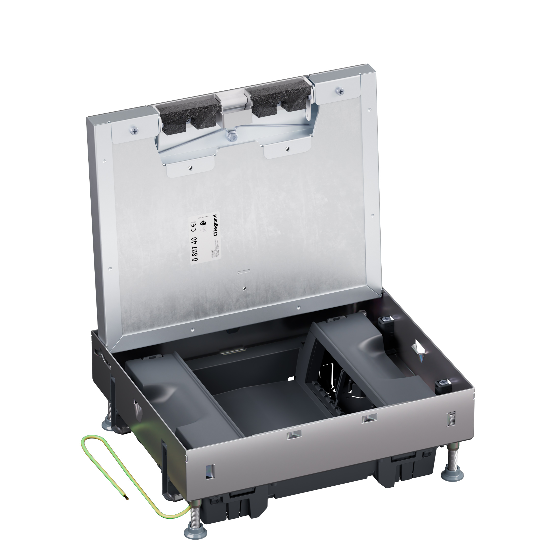 La boîte de sol permet l'accès et le raccordement des prises électriques, AV et VDI. Elle est composée de son cadre et de son couvercle