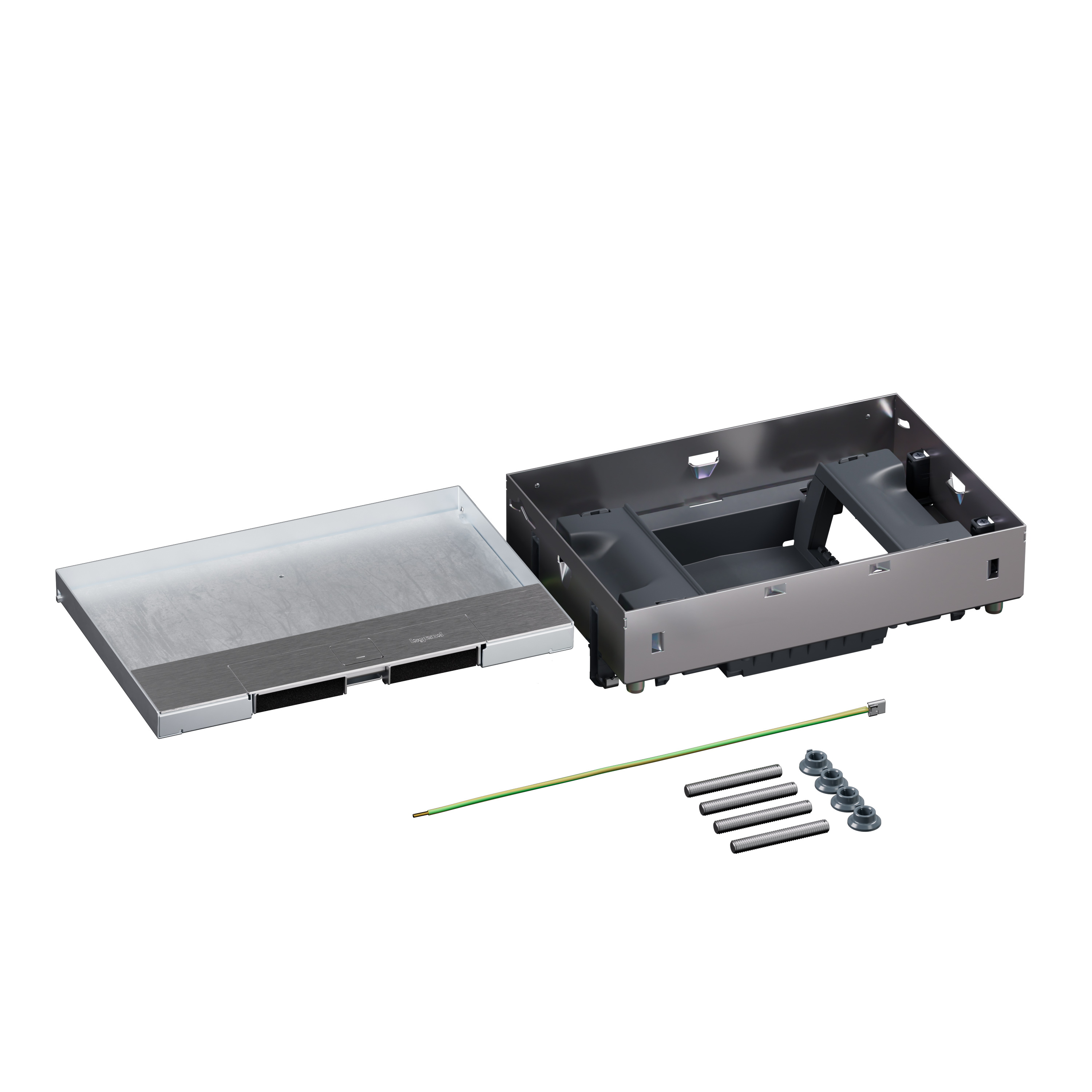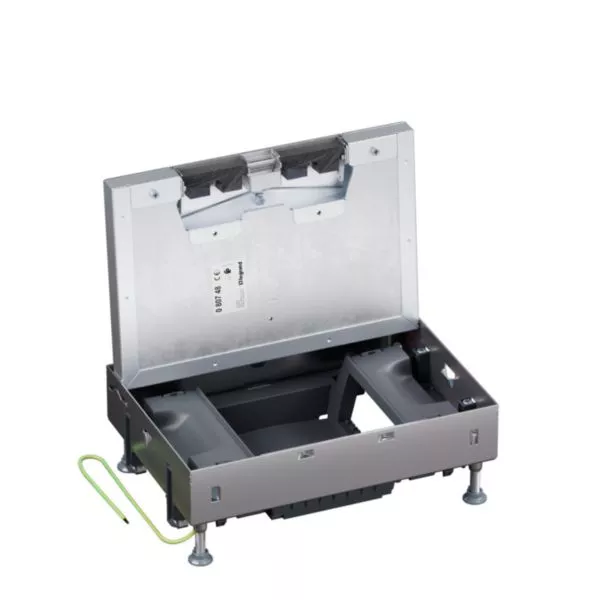 La boîte de sol permet l'accès et le raccordement des prises électriques, AV et VDI. Elle est composée de son cadre adapté au sol béton et de son couvercle
