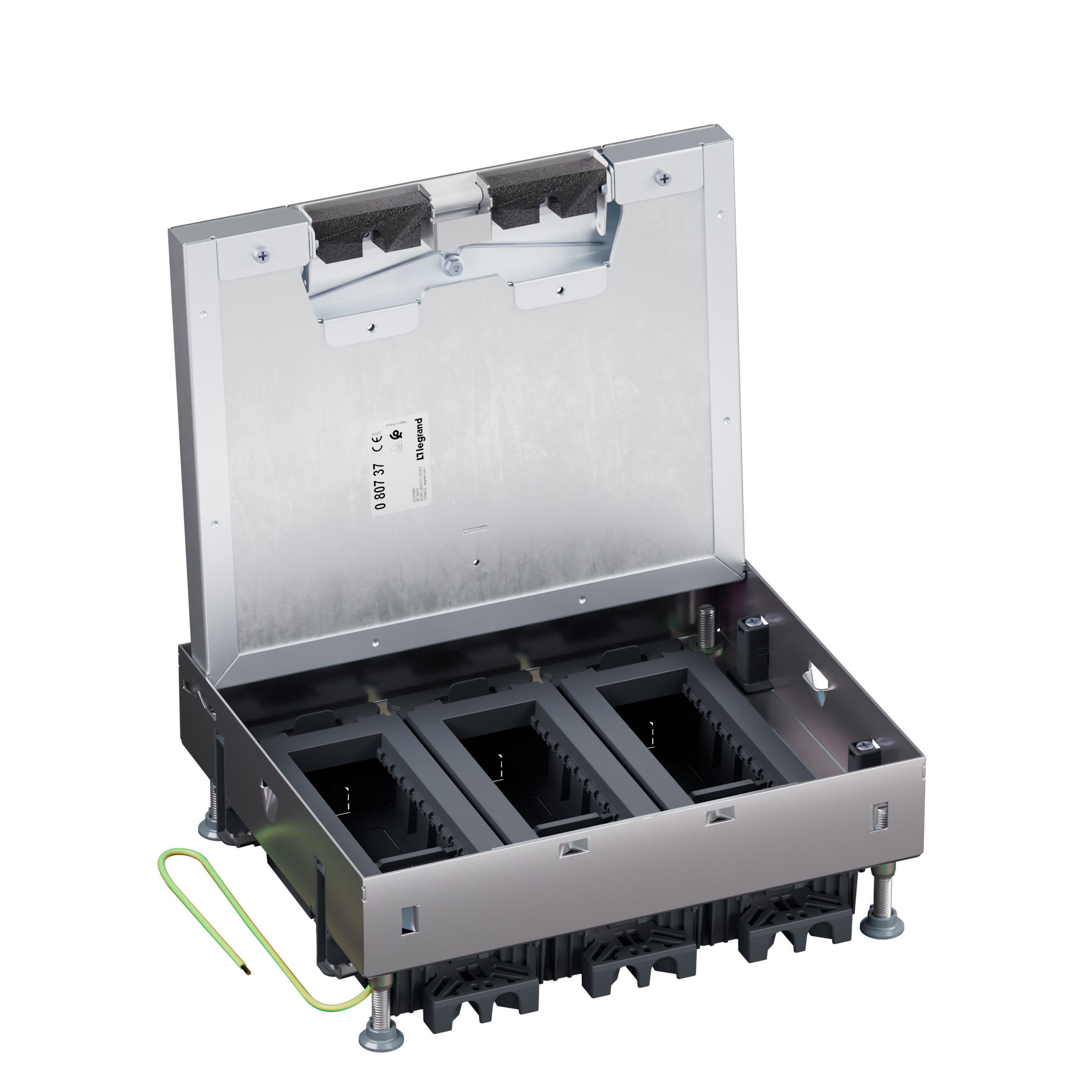 La boîte de sol permet l'accès et le raccordement des prises électriques, AV et VDI. Elle est composée de son cadre et de son couvercle