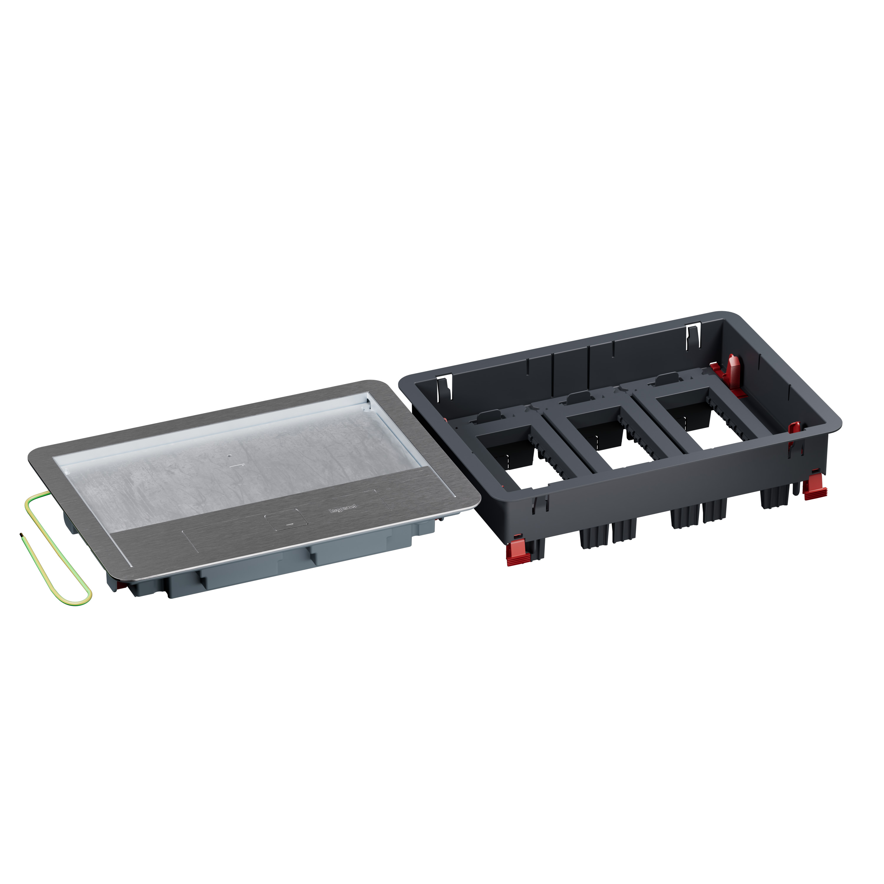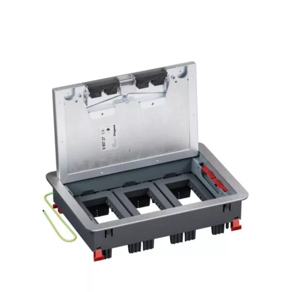 La boîte de sol permet l'accès et le raccordement des prises électriques, AV et VDI. Elle est composée de son cadre et de son couvercle