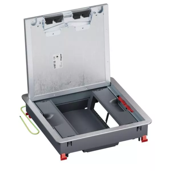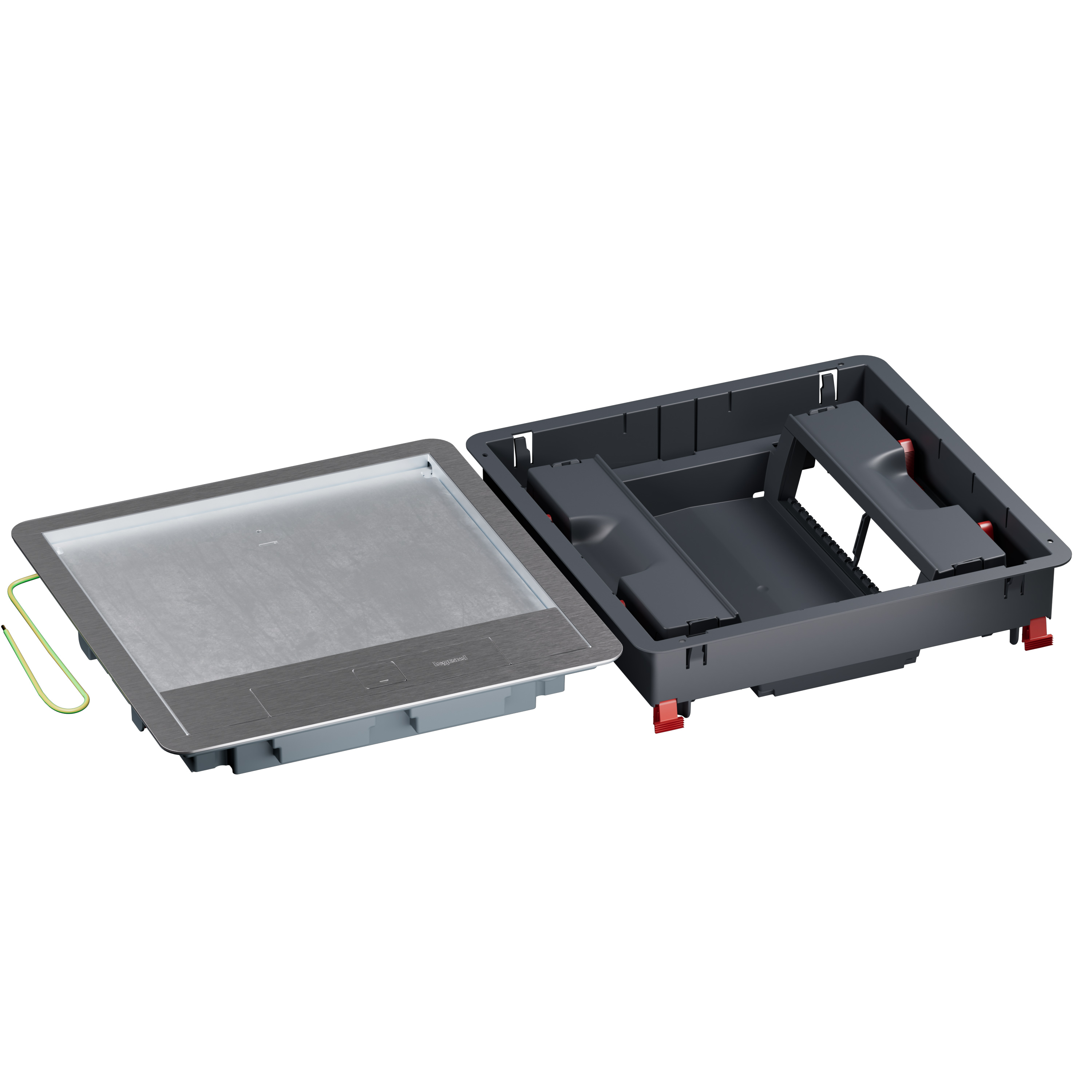 La boîte de sol permet l'accès et le raccordement des prises électriques, AV et VDI. Elle est composée de son cadre adapté au sol béton et de son couvercle
