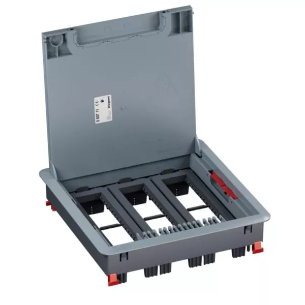 La boîte de sol permet l'accès et le raccordement des prises électriques, AV et VDI. Elle est composée de son cadre et de son couvercle