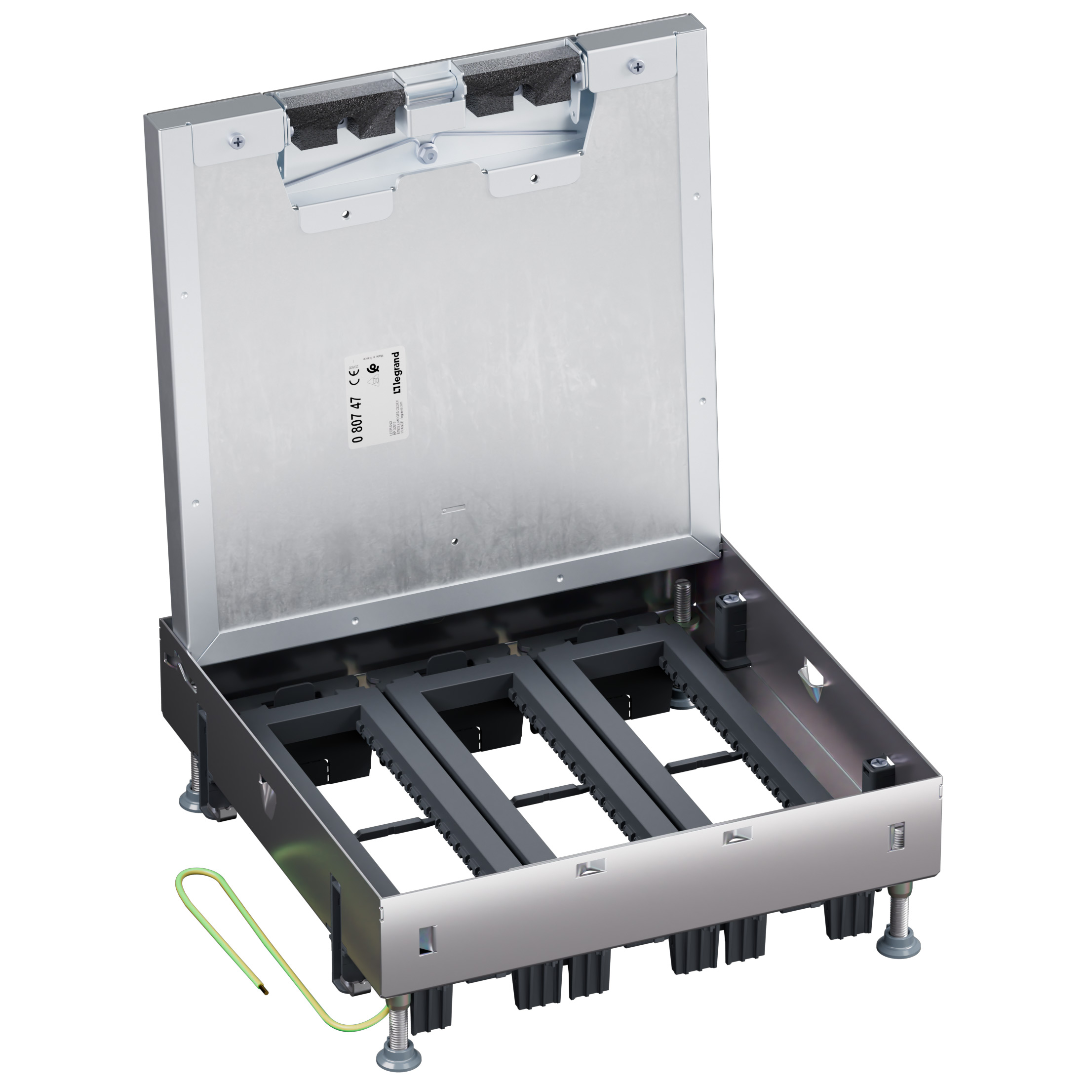 La boîte de sol permet l'accès et le raccordement des prises électriques, AV et VDI. Elle est composée de son cadre et de son couvercle