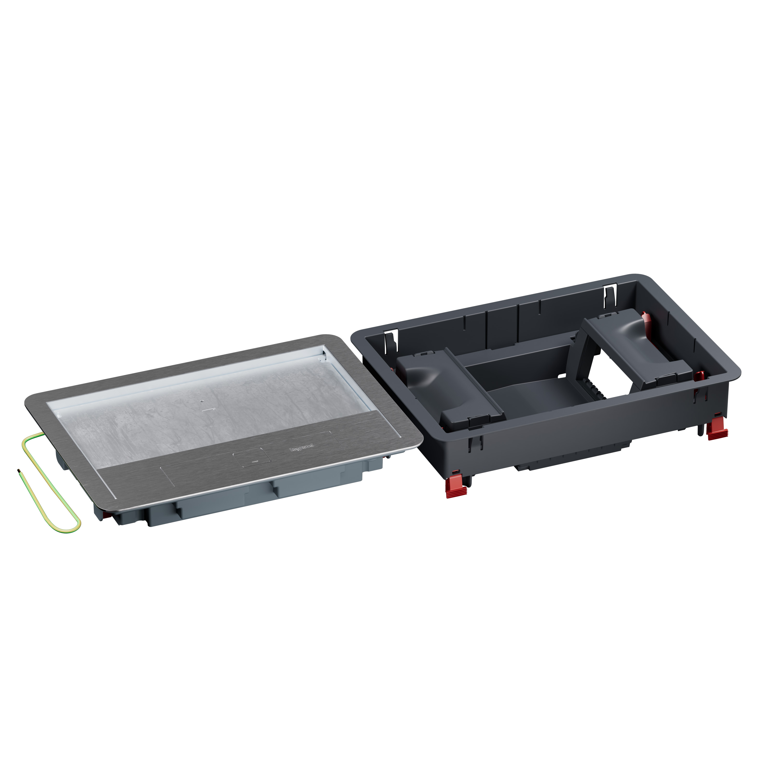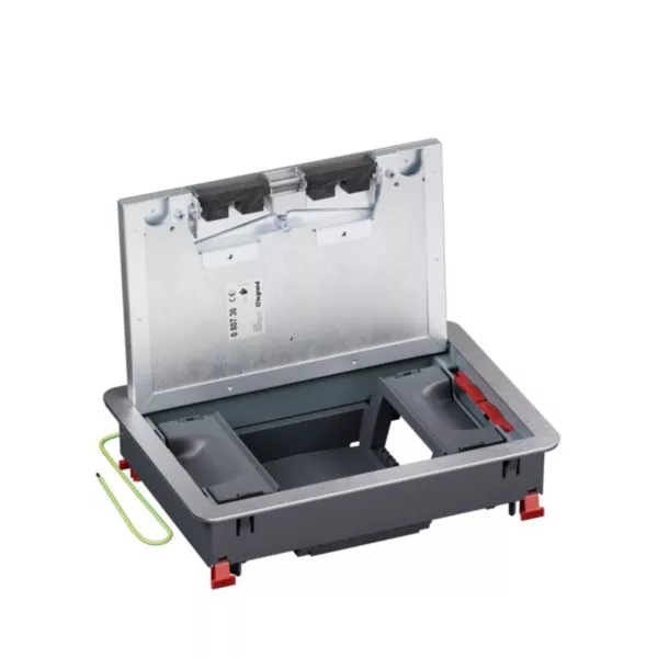 La boîte de sol permet l'accès et le raccordement des prises électriques, AV et VDI. Elle est composée de son cadre et de son couvercle