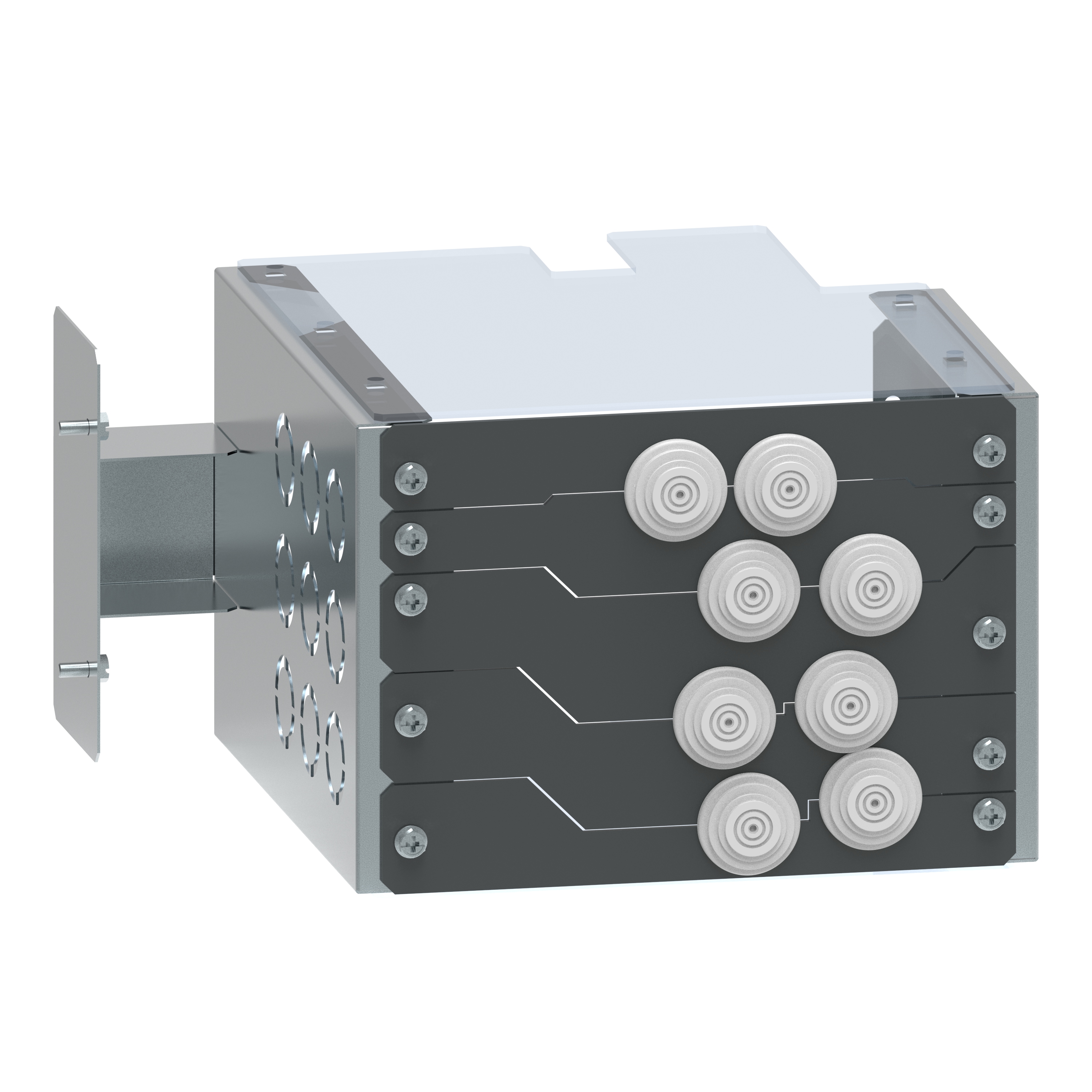 - Boîtier en acier galvanisé et cloison transparente pour le passage des câbles
