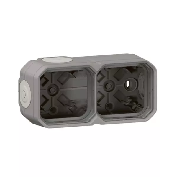 Boîtier saillie étanche Plexo 2 postes horizontaux et verticaux sans cloison avec 4 embouts à membrane - gris