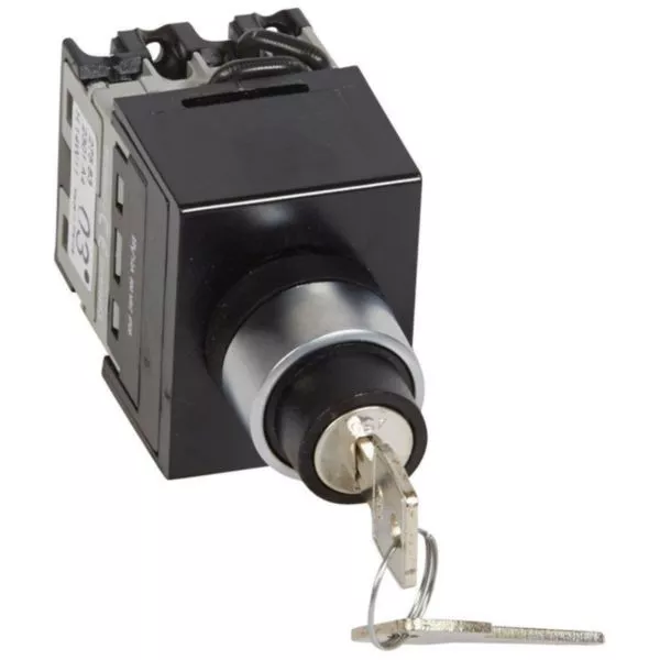 - Tête de commande à clé Ø22mm - Clé extractible en position 0-1-2-3 - 1 pôle - Gamme PR12 - Valeur maximum en AC21 : 16A - 3 contacts à ouverture positive et double coupure des pôles