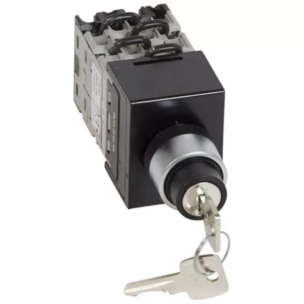 - Tête de commande à clé Ø22mm - Clé extractible en position 0 - 4 pôles - Gamme PR12 - Valeur maximum en AC21 : 16A - 8 contacts à ouverture positive et double coupure des pôles
