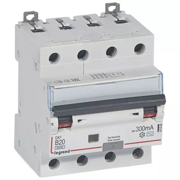 Disjoncteur différentiel monobloc DX³6000 arrivée haute départ bas à vis 4P 400V~ - 20A - typeAC 300mA - courbe B