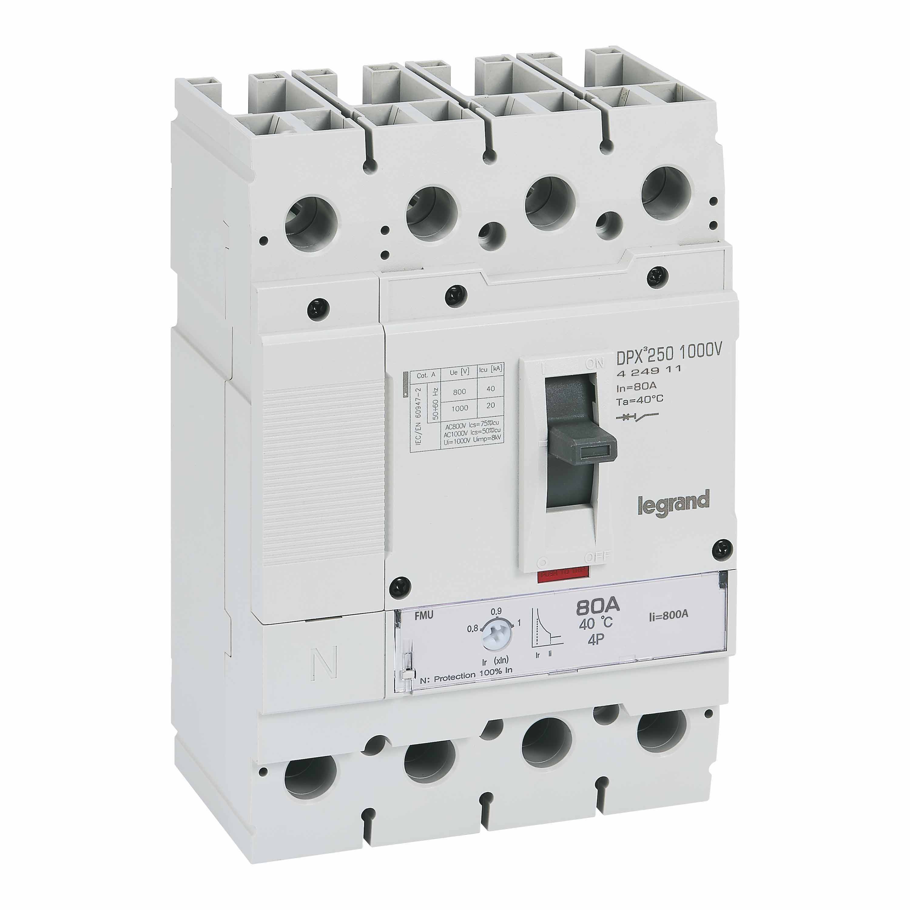Disjoncteur DPX³ 250 1000V - 4P - 80A - 20kA 1000V - Protection Protection thermomagnétique ajustable