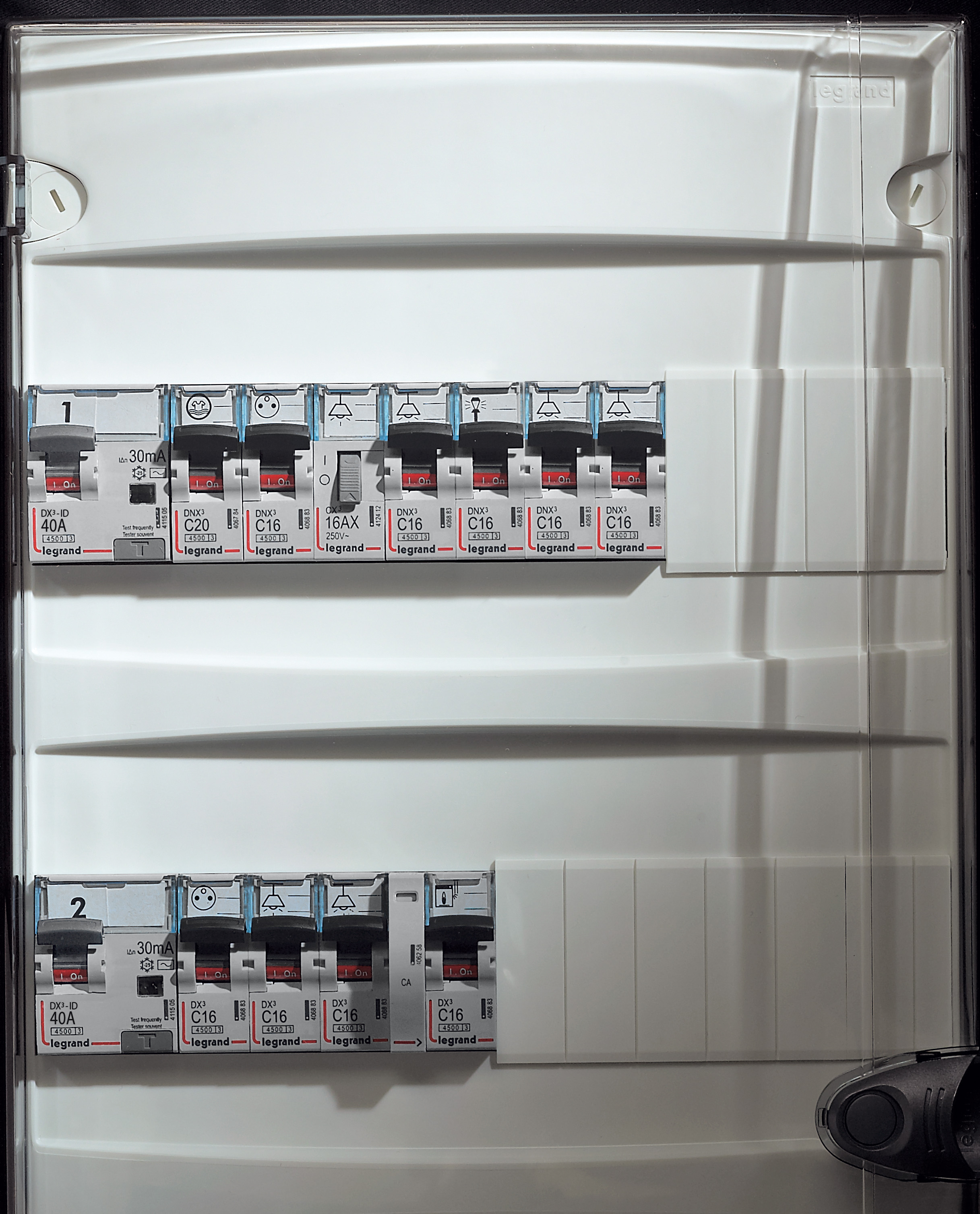 - 230V~ - Protection des départs : arrivée haute par bornes automatiques et sortie basse par bornes à vis