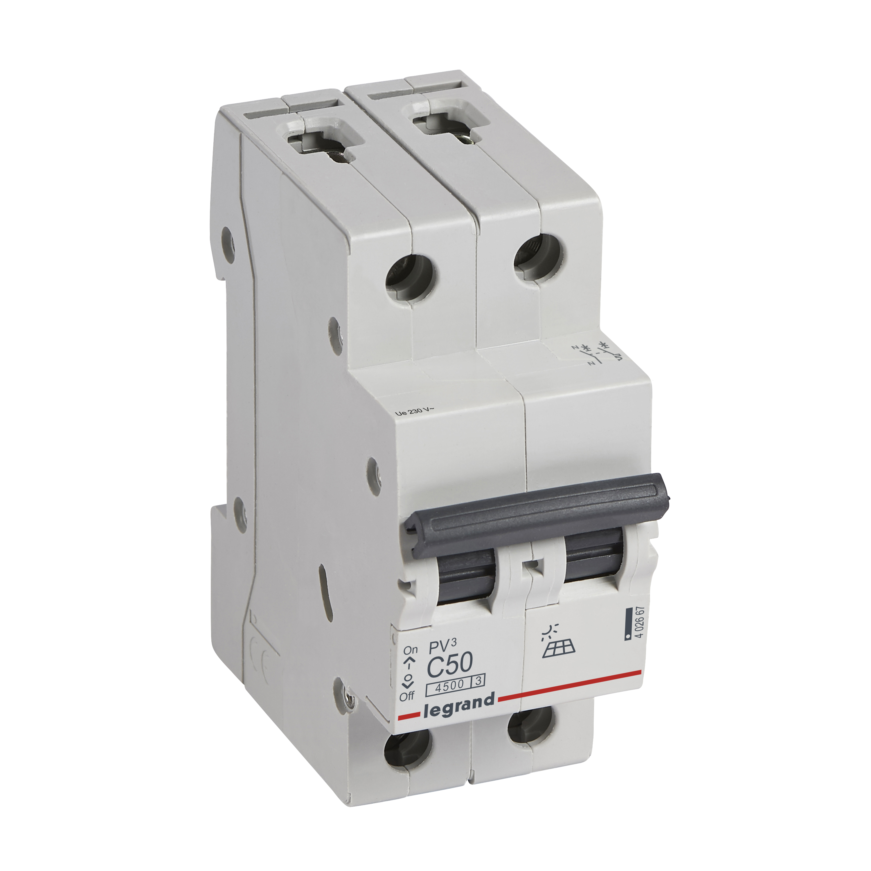 Disjoncteur PV³ Photovoltaïque AC 4500A arrivée et sortie borne à vis - 1P+N 230V~ 50A courbe C - 2 modules