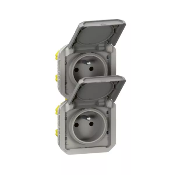 Double prise de courant précâblée 2x2P+T verticale étanche Plexo 16A 250V IP55 2 postes avec enjoliveurs finition gris