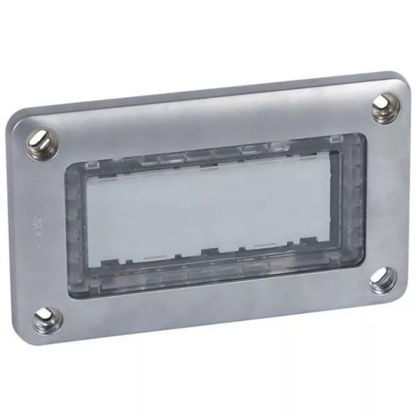 4 points de fixation par le chevillage de la plaque directement sur le mur et 4 obturateurs à monter en force sur la plaque (démontables uniquement par perçage) - Peut être installé en encastré (dans boîte d'encastrement) ou en saillie (sur cadre saillie) tout en conservant l'IK10