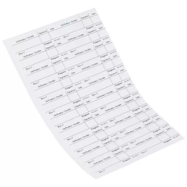 - Etiquette avec traitement spécial permettant l'écriture toutes encres et la pose immédiate sur le bloc