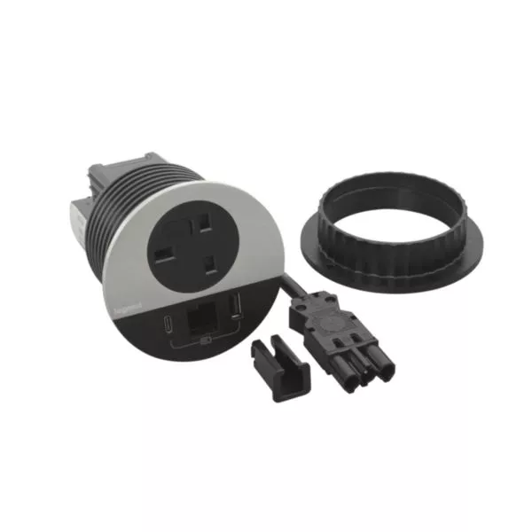 Incara Disq 80 équipé d'1 prise BS, 1 prise chargeur USB A+C 15W, un passe-câble et cordon de 0,5m avec fiche Wieland - métal
