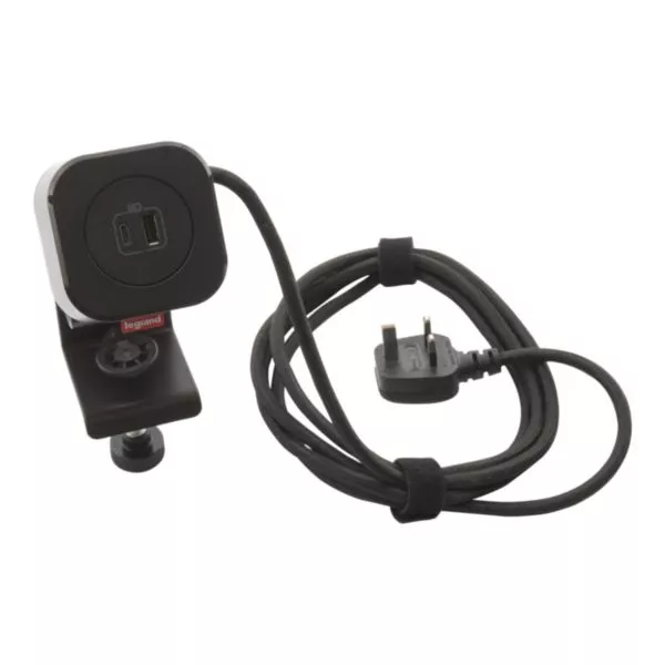 Incara Electr'On avec 1 prise chargeur USB A+C 15W, cordon tissé de 2,5m avec fiche BS et accessoire de fixation - noir livré complet