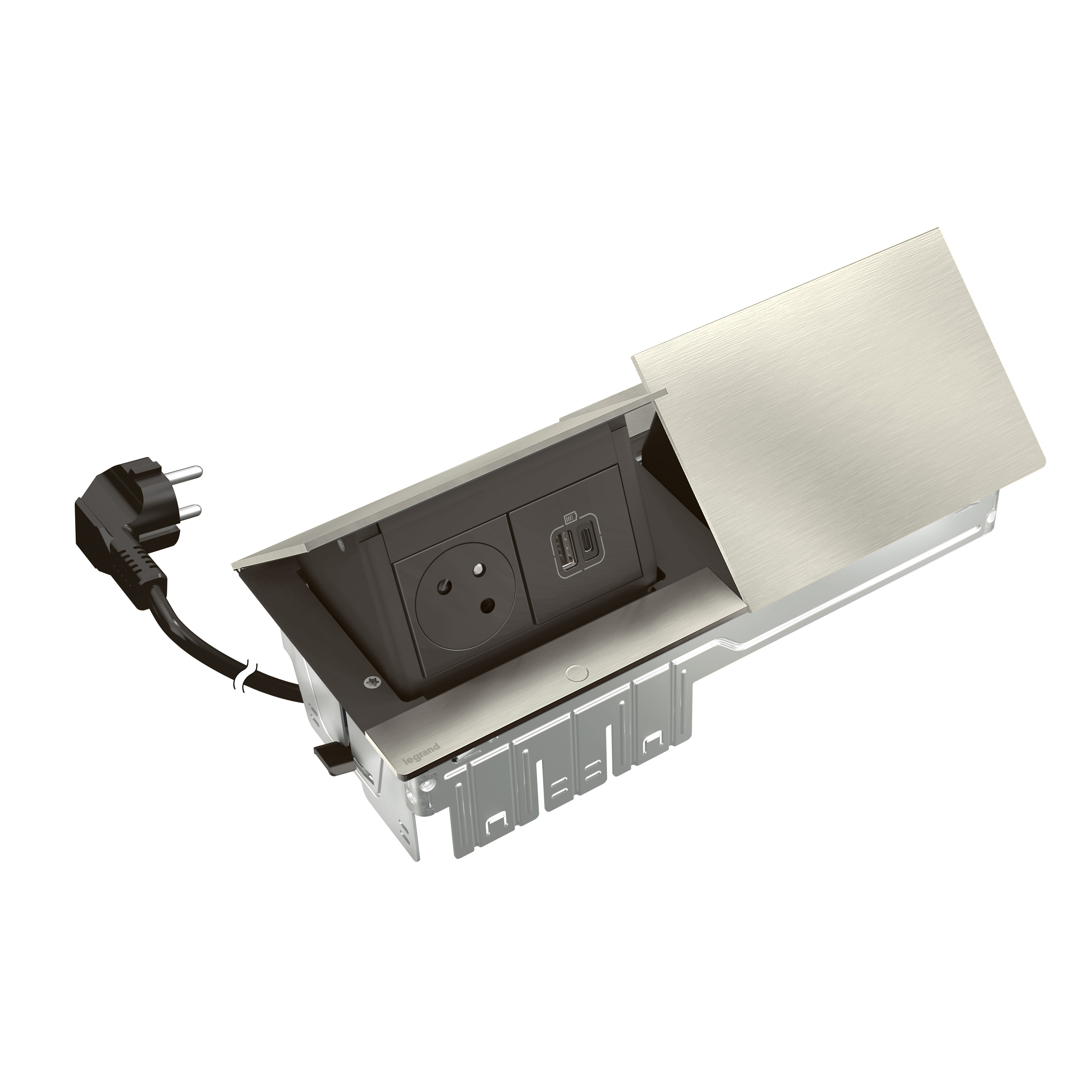 Incara Pop Up équipé de 2 prises 2P+T Surface et 2 chargeurs USB Type-A+Type-C 15W avec cordon - 2x4 modules Alu brossé