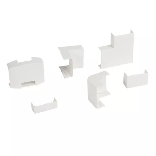 Kit chantier 50x20mm avec 4 angles intérieurs réf. 11582 , 2 angles extérieurs réf. 11583 , 6 angles plats réf. 11584 , 4 embouts réf. 11585 , 6 joints de couvercle réf. 11578 et 2 tés réf. 11587
